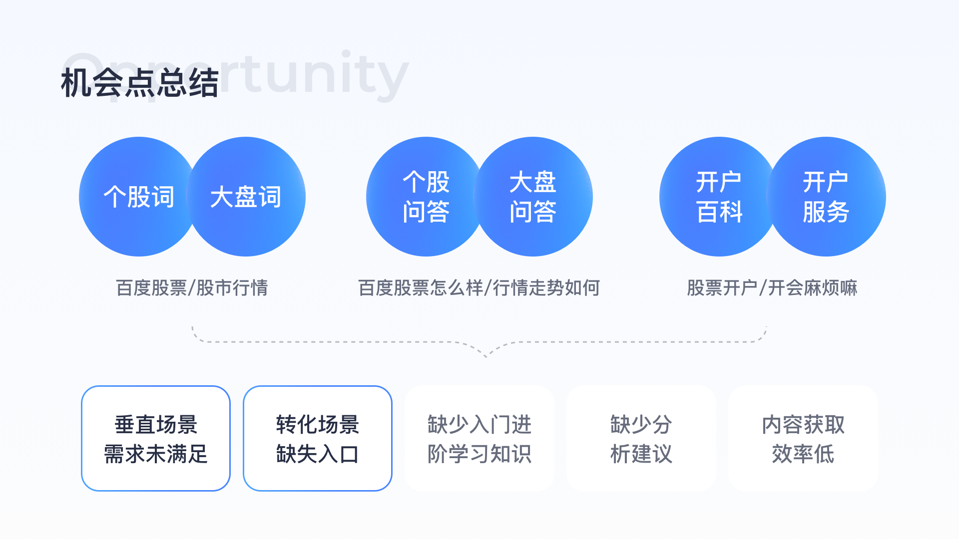 分析需求:典型搜索詞股票開戶等轉(zhuǎn)化詞,線上僅有開戶入口列表,但實(shí)際搜索用戶有潛在的查找開戶方式需求未滿足,因此需先滿足用戶了解開戶流程的需求,再提供轉(zhuǎn)化入口。