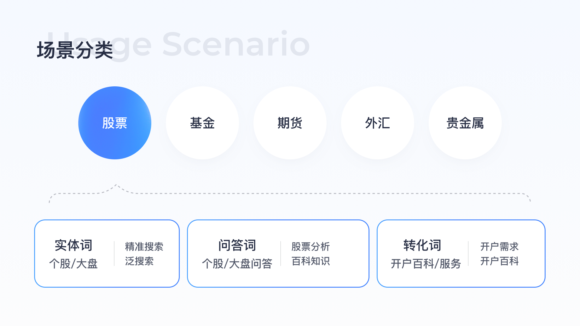 不同場(chǎng)景下用戶需求不同,設(shè)計(jì)解決方案會(huì)有差異,金融品類需求豐富包括股票/基金/期貨/外匯/貴金屬,需求類型包括實(shí)體需求/問答需求/轉(zhuǎn)化需求,需通過數(shù)據(jù)分析了解各類需求占比,可以作為后續(xù)優(yōu)化優(yōu)先級(jí)的判斷指標(biāo),經(jīng)過數(shù)據(jù)分析后得出結(jié)論股票品類需求及用戶占比遠(yuǎn)高于其他品類,以股票品類舉例細(xì)化用戶需求,列舉搜索詞,便于后續(xù)進(jìn)行線上問題走查挖掘設(shè)計(jì)機(jī)會(huì)點(diǎn)。
