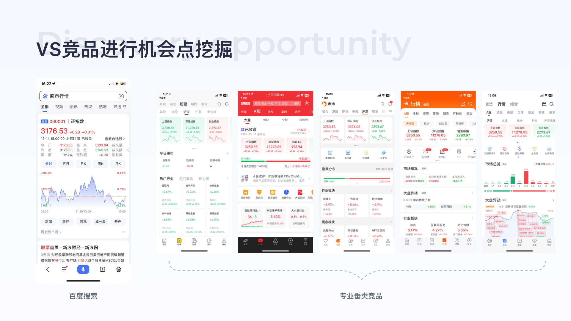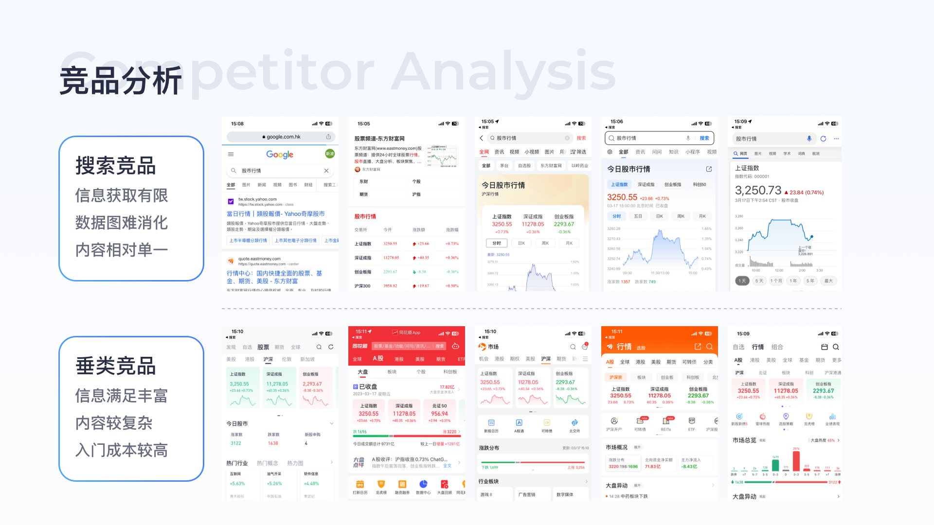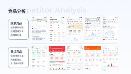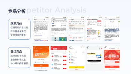 競(jìng)品分析:搜索競(jìng)品包括今日頭條、夸克、QQ瀏覽器、必應(yīng)、谷歌均以滿足用戶查找需求為主,信息以純文本形式展現(xiàn),消費(fèi)成本較高,且未滿足用戶潛在的開戶需求,垂類競(jìng)品開戶頁(yè)對(duì)流程、材料介紹均不完整、缺少完整的介紹及問題解答。