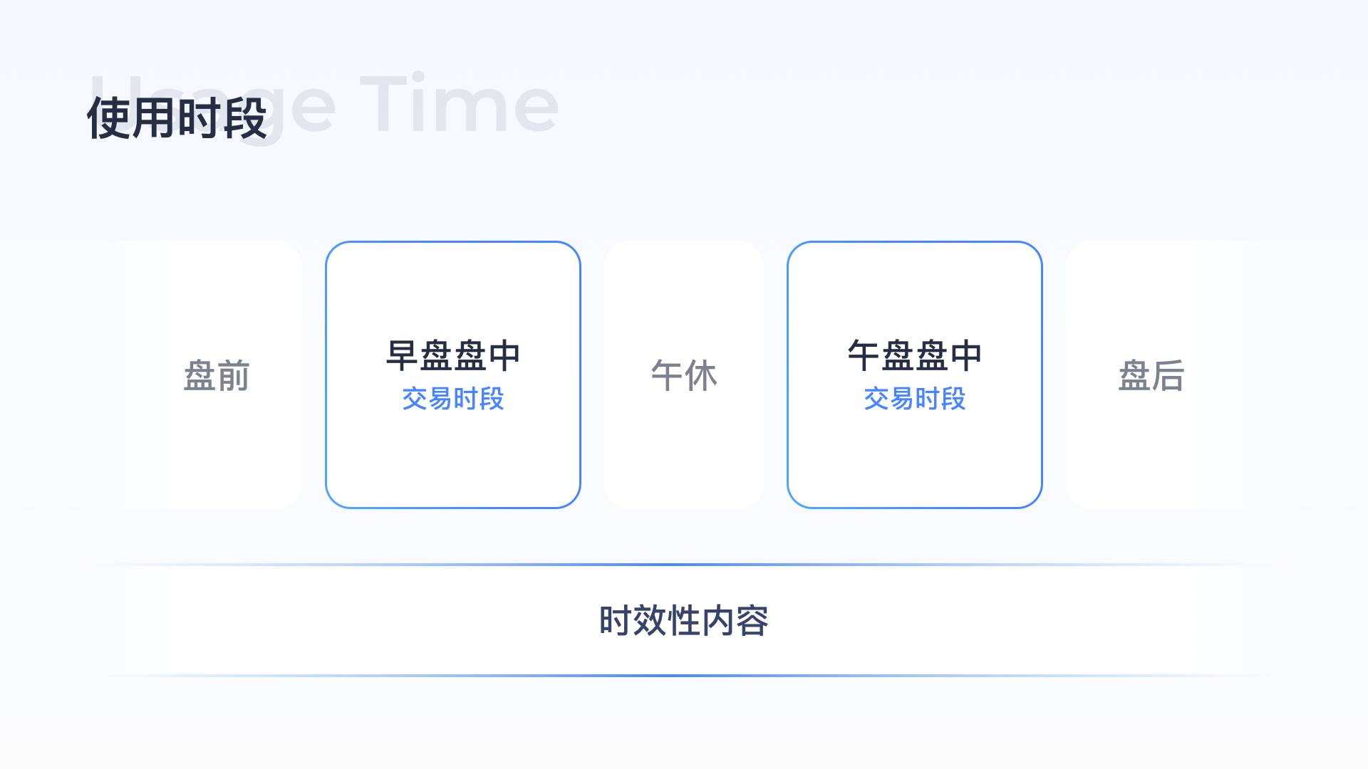 股票交易時(shí)段有固定的交易周期,包括盤前/早盤盤中/午休/午盤盤中/盤后幾個(gè)固定時(shí)段,不同時(shí)段用戶需求不同,了解不同時(shí)段的用戶需求可以更好的滿足用戶,比如開盤過程中用戶想看到更實(shí)時(shí)更專業(yè)的行情信息、實(shí)時(shí)的資訊動(dòng)態(tài),而在盤前/盤后用戶更想看到的是今日大盤的走勢(shì)預(yù)測(cè)/收盤后的大盤總結(jié),除了固定周期的用戶需求,突發(fā)的新聞資訊類時(shí)效性內(nèi)容對(duì)用戶做決策分析也很重要。