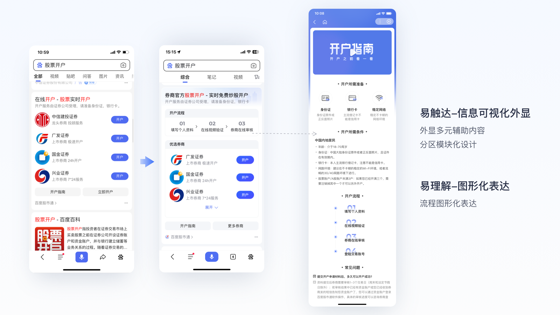 策略設(shè)計(jì) :結(jié)合用戶需求優(yōu)先級(jí)對(duì)信息模塊進(jìn)行分區(qū),可視化外顯優(yōu)先滿足開戶流程需求,再提供優(yōu)質(zhì)券商開戶入口,考慮到搜索結(jié)果頁(yè)卡片展示屏效,完整開戶指南配合在落地頁(yè)內(nèi)呈現(xiàn)。