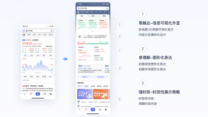 基于小白用戶經(jīng)驗(yàn)少、金融垂類專業(yè)知識(shí)多晦澀難懂、數(shù)據(jù)復(fù)雜難理解的背景,制定易觸達(dá)、易理解2個(gè)策略,通過信息可視化外顯、圖表圖形化表達(dá)、關(guān)鍵信息外顯等方式降低用戶消費(fèi)門檻,提高信息獲取效率,強(qiáng)時(shí)效是基于股票特有的盤前/盤中/盤后周期性交易特征擬定的,可通過此特征打造更加差異化的滿足。