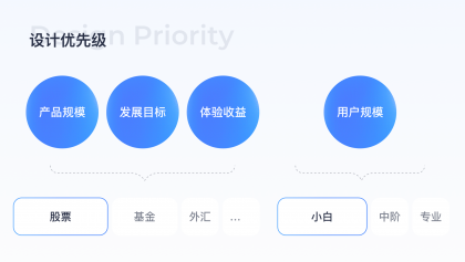 由于開發(fā)資源有限,不能一次做完所有產(chǎn)品設(shè)計(jì)優(yōu)化,因此需針對(duì)優(yōu)化內(nèi)容排布優(yōu)先級(jí),對(duì)高優(yōu)場(chǎng)景進(jìn)行優(yōu)化,這里的方法是結(jié)合用戶分類規(guī)模、產(chǎn)品品類規(guī)模、發(fā)展目標(biāo)、體驗(yàn)收益高低明確優(yōu)化優(yōu)先級(jí),通過上述精細(xì)化分析得出結(jié)論股票場(chǎng)景用戶規(guī)模大,且小白用戶占比高,因此在股票場(chǎng)景下針對(duì)偏小白用戶高優(yōu)進(jìn)行設(shè)計(jì)優(yōu)化。