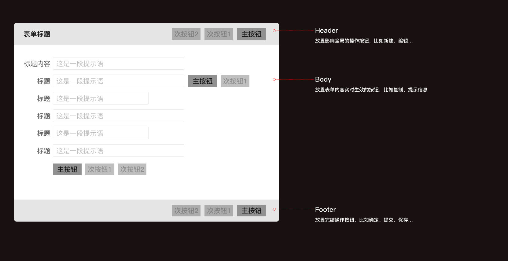 表單中比較常見(jiàn)的按鈕大概有“保存”、“提交”、“取消”、“關(guān)閉”、“暫存”、“下一步”、“上一步”...由于B端產(chǎn)品業(yè)務(wù)邏輯較復(fù)雜通常頁(yè)面中會(huì)有很多操作按鈕,為了更快捷準(zhǔn)確的操作,就需要對(duì)按鈕按照重要程度分為主按鈕,次級(jí)按鈕;為了達(dá)到這樣的目的僅僅依靠按鈕樣式還遠(yuǎn)遠(yuǎn)不夠,還得根據(jù)視覺(jué)動(dòng)線(xiàn)給出合理的排列順序。關(guān)于按鈕順序,最常見(jiàn)的疑問(wèn)是主按鈕應(yīng)該在次級(jí)按鈕左邊還是右邊,這里建議使用基于Ant Design 的設(shè)計(jì)原則,將規(guī)范定為:左對(duì)齊從左往右閱讀,右對(duì)齊從右往左閱讀;
