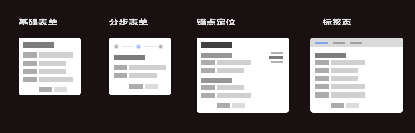 表單在設(shè)計(jì)時(shí)需要對(duì)其進(jìn)行合理的歸納簡(jiǎn)化,降低表單填寫(xiě)負(fù)荷。 通常我們將表單分為基礎(chǔ)表單、分步表單、錨點(diǎn)定位、標(biāo)簽頁(yè)這幾類(lèi)。