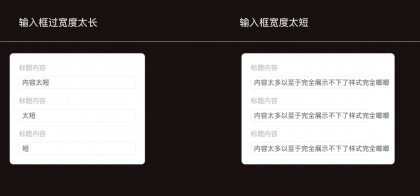 采用這樣的處理方式時(shí),需要控制表單內(nèi)輸入內(nèi)容的長(zhǎng)度高度一致,不然會(huì)面臨以下兩種尷尬:面對(duì)尷尬一(長(zhǎng)度定太短)內(nèi)容擴(kuò)展性太差,無(wú)法同時(shí)滿(mǎn)足大段信息展示。面對(duì)尷尬一(長(zhǎng)度定太長(zhǎng))輸入框當(dāng)只填寫(xiě)一兩個(gè)字符時(shí),會(huì)很空視覺(jué)效果不佳。