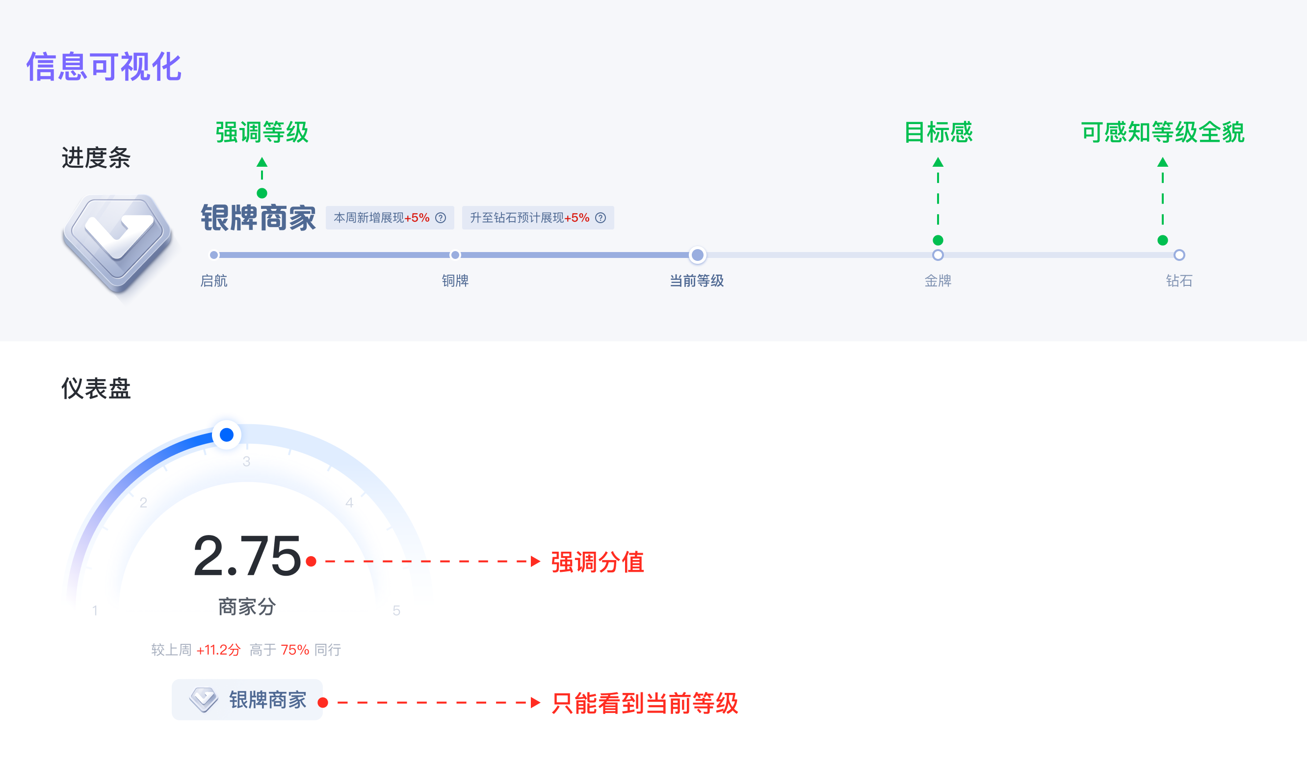 當(dāng)復(fù)雜的信息難以被商家理解時(shí),可視化作為有效手段,旨在把數(shù)據(jù)資料以視覺化的方式表現(xiàn)出,有效地向受眾傳播信息??梢暬紫纫鶕?jù)信息結(jié)構(gòu)進(jìn)行圖表選型,在商家等級(jí)項(xiàng)目中,我選擇了兩種數(shù)據(jù)圖表(進(jìn)度條VS儀表盤)來(lái)進(jìn)行商家等級(jí)的可視化表達(dá),當(dāng)兩種圖表放到一起時(shí),可以很明顯的發(fā)現(xiàn)兩者之間的差異,基于這個(gè)項(xiàng)目想要強(qiáng)調(diào)的等級(jí)概念,最終選擇進(jìn)度條展示商家等級(jí)的成長(zhǎng)進(jìn)度,并激勵(lì)其追求下一個(gè)等級(jí)的提升。這樣,商家能夠準(zhǔn)確感知成長(zhǎng)進(jìn)度,衡量自己在商家等級(jí)體系里所處的分位以獲取更多成長(zhǎng)動(dòng)力。