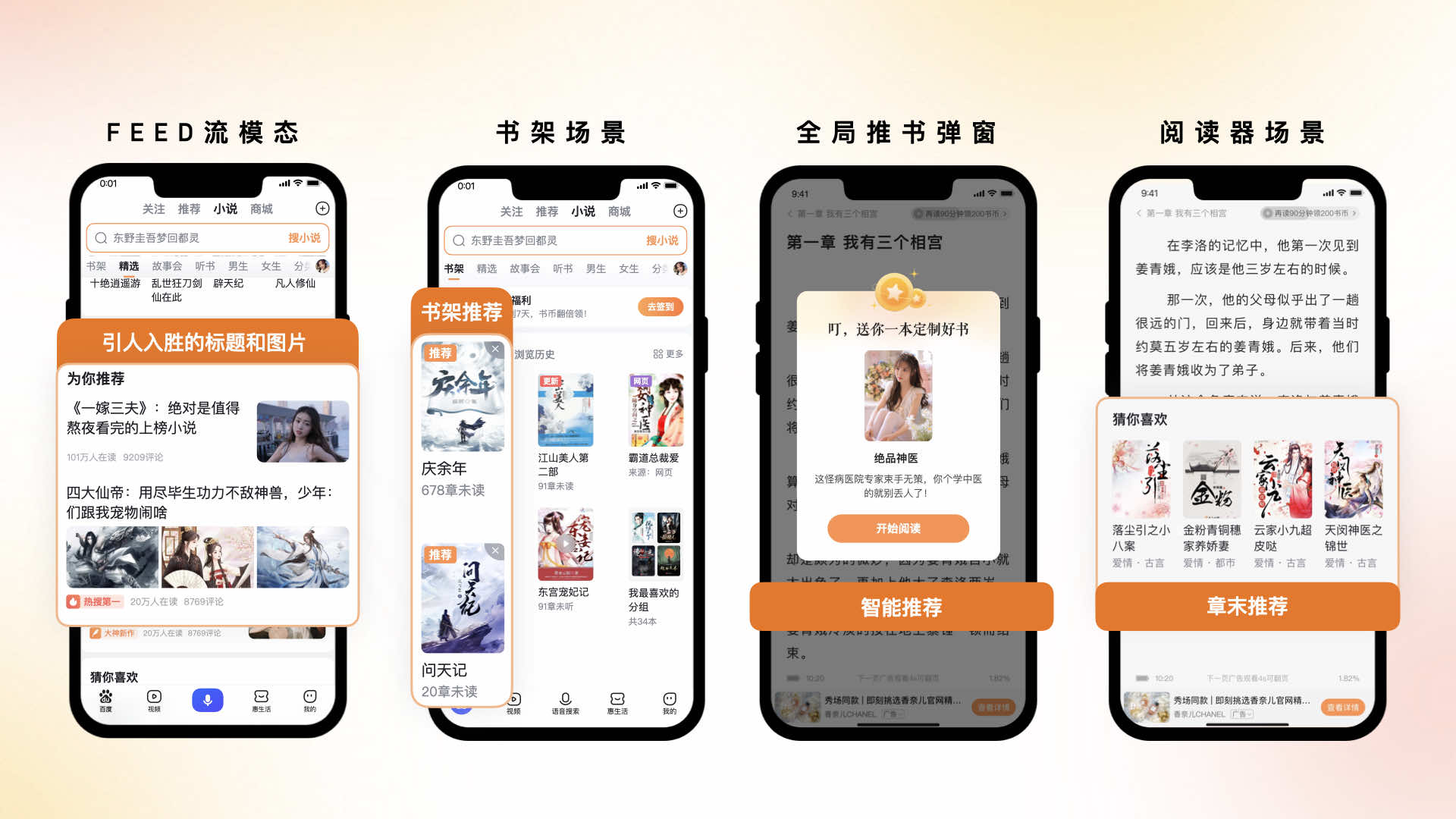 在推薦形式上,我們也采用了多樣化的推薦方式。例如在首頁增加了feed流形態(tài)的信息模塊,以更直觀的圖文展現(xiàn)方式,幫助用戶發(fā)現(xiàn)他感興趣的內(nèi)容。在書架場景,針對于書架內(nèi)容少的用戶,自動(dòng)的放置兩本高流量書籍,幫助用戶高效的觸達(dá)內(nèi)容。與此同時(shí),我們還會(huì)根據(jù)用戶行為數(shù)據(jù),采用彈窗形式和章尾推薦等形式主動(dòng)向用戶推薦與其喜好度高的內(nèi)容,方便用戶高效的觸達(dá)他感興趣的內(nèi)容。