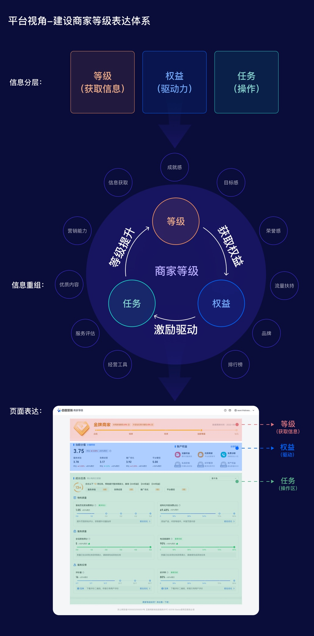 信息分層:開始頁面設(shè)計(jì)之前需要設(shè)計(jì)信息結(jié)構(gòu)和組織方式,以便商家可以輕松找到需要的信息。以商家等級(jí)為例,首先根據(jù)信息價(jià)值將信息分為<等級(jí)-權(quán)益-任務(wù)>三大類(等級(jí)作銜接、權(quán)益提供驅(qū)動(dòng)力、任務(wù)是需完成的動(dòng)作)。