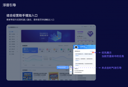 浮層:將操作入口前置披露,提升商家感知同時(shí)還可以縮短操作步長。在商家等級(jí)項(xiàng)目里,衡量商家主動(dòng)經(jīng)營的標(biāo)準(zhǔn)是做任務(wù),所以任務(wù)入口的前置披露是提升主動(dòng)經(jīng)營的關(guān)鍵舉措。于是,圍繞商家等級(jí)包裝了“經(jīng)營助手”的概念,幫助平臺(tái)給商家推薦一些成長任務(wù)和優(yōu)化建議,并在平臺(tái)首頁主動(dòng)彈出,以此提高任務(wù)觸達(dá)率。但使用這種主動(dòng)觸達(dá)手段時(shí),需要考慮對(duì)商家的打擾和阻斷情況,所以需要對(duì)主動(dòng)彈出的頻率作限制,然后配合氣泡和標(biāo)簽等視效元素吸引商家視線。這樣可以引導(dǎo)商家參與商家等級(jí)完成任務(wù),促進(jìn)其成長和等級(jí)提升。