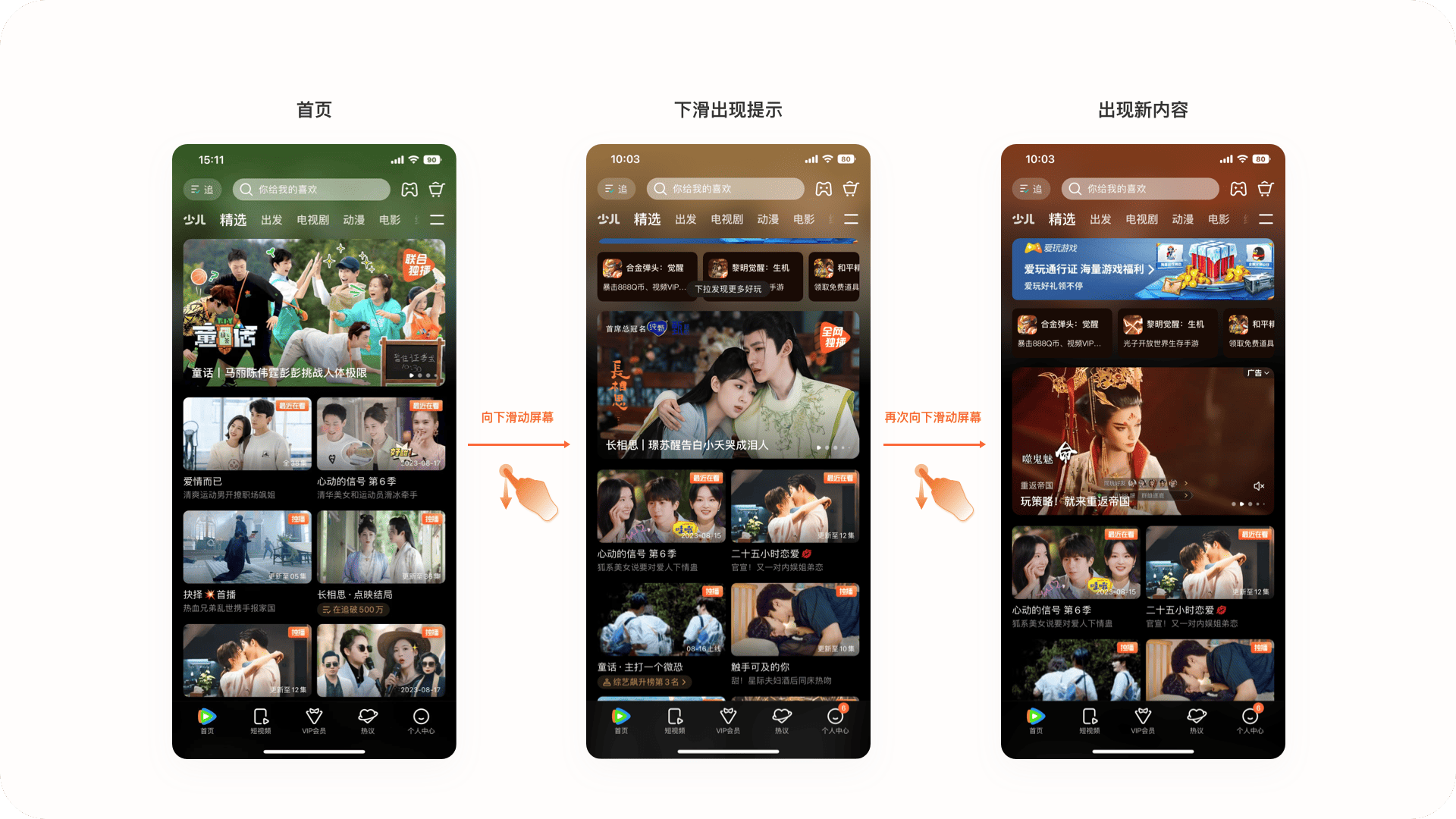 2.1.5設(shè)計(jì)亮點(diǎn):下拉刷新新玩法大多數(shù)產(chǎn)品下拉都為刷新界面操作,但騰訊視頻對(duì)下拉進(jìn)行兩部交互操作,用戶下拉到第一個(gè)階段會(huì)出現(xiàn)提示"下拉發(fā)現(xiàn)更多好玩"當(dāng)前這時(shí)用戶松手可以進(jìn)行常規(guī)刷新操作, 但用戶看到這樣的提示會(huì)更想知道在向下拉到會(huì)帶來(lái)怎么的內(nèi)容,當(dāng)用戶再次下拉后會(huì)出現(xiàn)對(duì)應(yīng)的內(nèi)容推薦,類似于游戲推廣與熱播劇推廣,賦予用戶驚喜感的同時(shí)還能增加廣告收入。