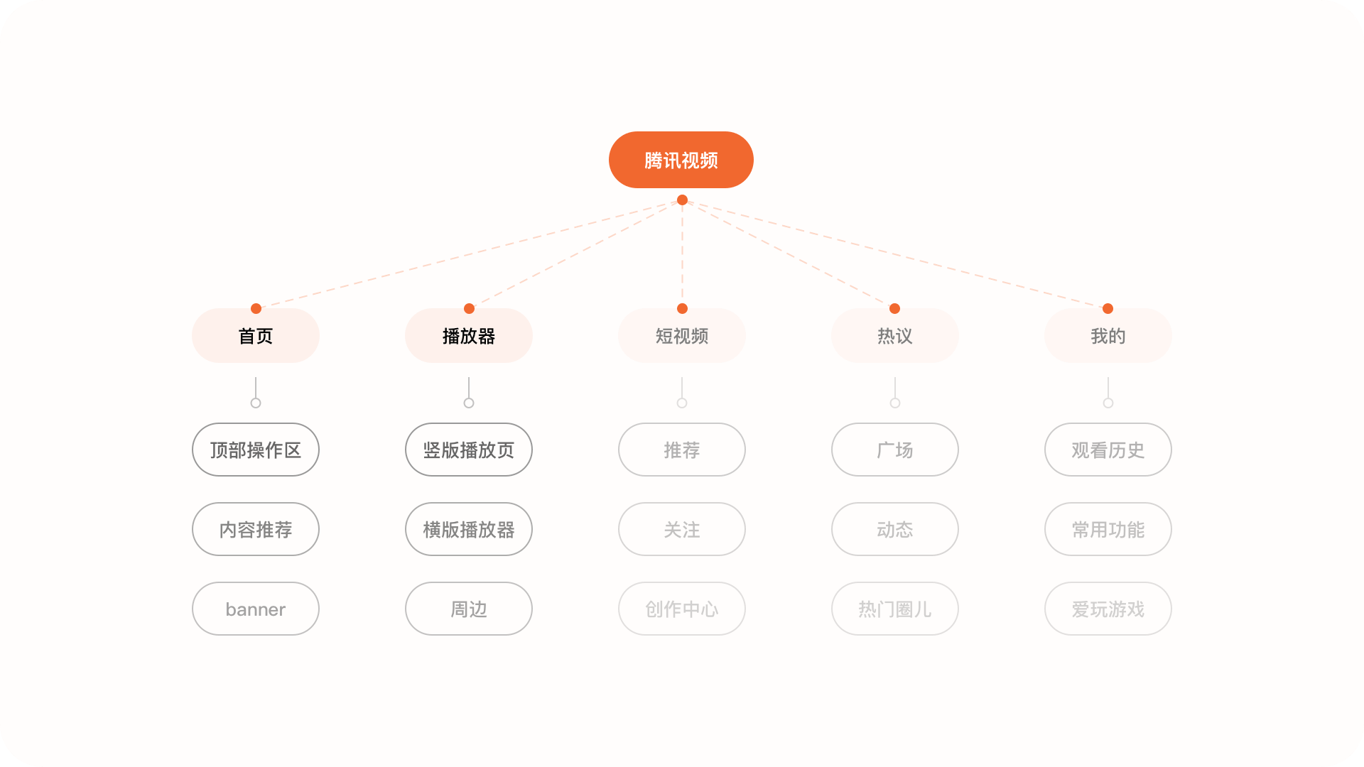 1.內(nèi)容結(jié)構(gòu)作為視頻內(nèi)容平臺(tái),通過(guò)對(duì)騰訊視頻APP的結(jié)構(gòu)梳理,發(fā)現(xiàn)產(chǎn)品內(nèi)大部分的內(nèi)容都是圍繞視頻來(lái)進(jìn)行拓展,整體框架分為:首頁(yè)、短視頻、VIP會(huì)員、熱議、我的這幾個(gè)模塊。本次我們主要針對(duì)于首頁(yè)與播放器這兩個(gè)場(chǎng)景進(jìn)行重點(diǎn)分析