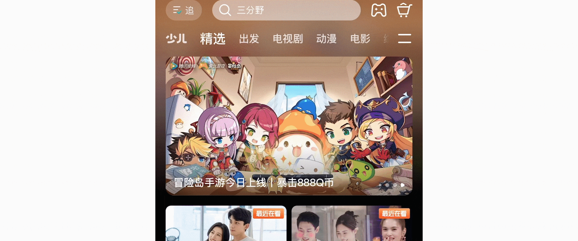 頂部操作區(qū)一般集合著大量的操作入口,主要功能如下:加追與預(yù)約:其中包含用戶添加的追劇列表、熱門預(yù)約、歷史觀看記錄等功能搜索:點(diǎn)擊進(jìn)入搜索結(jié)果頁(yè),其中包含熱門榜單、歷史記錄,用戶也可以快速搜索自己需要查找的視頻內(nèi)容游戲中心:游戲中心主要是推廣騰訊自家的游戲內(nèi)容,通過(guò)游戲中心對(duì)游戲進(jìn)行引流與拉新周邊商城:周邊商城里面為視頻的周邊產(chǎn)品,用戶可以在周邊商城中進(jìn)行商品購(gòu)買