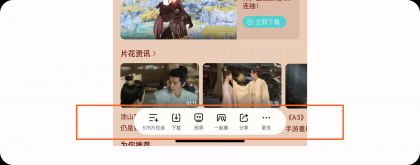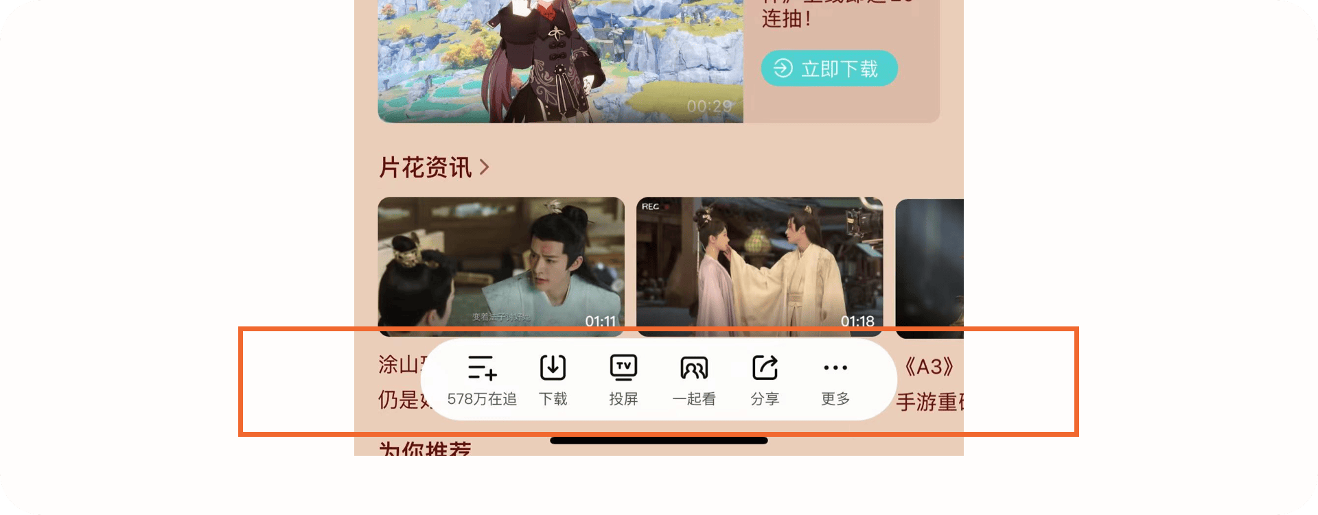 3.1.2產(chǎn)品亮點(diǎn):底部操作區(qū)功能相比其他產(chǎn)品,騰訊視頻在進(jìn)入豎屏播放頁(yè)后不會(huì)再頂部的視頻中默認(rèn)展示操作內(nèi)容,給用戶帶來(lái)更好的觀看體驗(yàn),并且把視頻相關(guān)的操作內(nèi)容放置底部做成一個(gè)底部操作區(qū),用戶可以在底部快速的對(duì)視頻進(jìn)行操作如:下載、投屏、一起看、分享等。而不是把功能分散在界面中,這樣不僅可以降低用戶的尋找這些高頻操作的成本,同時(shí)提升視頻的觀看體驗(yàn)。