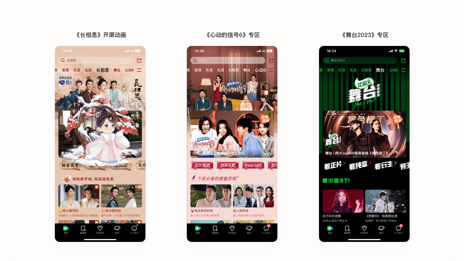 2.2.4設(shè)計(jì)亮點(diǎn):不一樣的定制化分區(qū)內(nèi)容頁(yè)騰訊視頻會(huì)根據(jù)站內(nèi)的熱門內(nèi)容進(jìn)行定制化分區(qū)內(nèi)容頁(yè),雖然這種形式在各個(gè)視頻平臺(tái)都有設(shè)計(jì),但騰訊視頻的似乎更加與眾不同,它相比其他競(jìng)品不僅增加了開(kāi)屏動(dòng)畫,加強(qiáng)界面氛圍感,同時(shí)在功能上增加了一級(jí)標(biāo)題,如在長(zhǎng)相思專題中的“獨(dú)家花絮、有聲書、看微綜、相思榜”等入口,可以讓用戶在頁(yè)面中發(fā)現(xiàn)更多劇情本身以外的衍生內(nèi)容,一級(jí)標(biāo)題的形式也可以讓用戶直達(dá)視頻播放頁(yè),快速了解想要看到的視頻內(nèi)容。