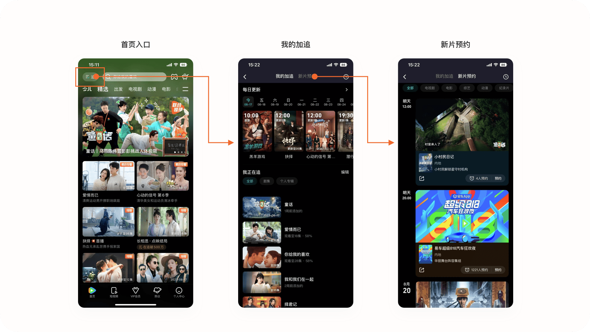 2.1.1產(chǎn)品亮點(diǎn):加追與預(yù)約功能在首頁(yè)左上角增加最近再追功能,此功能讓用戶在首頁(yè)就可以更快速的找到自己在追的內(nèi)容,而且在頁(yè)面中還包含新片預(yù)約和歷史瀏覽記錄功能,讓用戶在了解更多預(yù)約內(nèi)容與歷史記錄。此功能放在首頁(yè)很好的降低用戶操作成本,提升產(chǎn)品體驗(yàn)。
