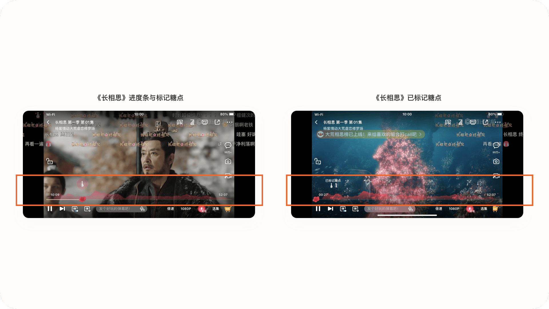 3.2.1設(shè)計(jì)亮點(diǎn):定制化進(jìn)度條與標(biāo)記糖點(diǎn)對(duì)應(yīng)熱門視頻內(nèi)容,騰訊視頻會(huì)定制化進(jìn)度條樣式與進(jìn)度點(diǎn)樣式,(如《長(zhǎng)相思》中定制紅色木槿花)讓用戶更加沉浸的觀看體驗(yàn),同時(shí)在進(jìn)度條上方有標(biāo)記樣式,用戶點(diǎn)擊會(huì)觸發(fā)標(biāo)記動(dòng)效與糖點(diǎn),所有標(biāo)記的糖點(diǎn)數(shù)據(jù)也會(huì)以波動(dòng)圖的形式顯示在進(jìn)度條上方,提高互動(dòng)玩法。