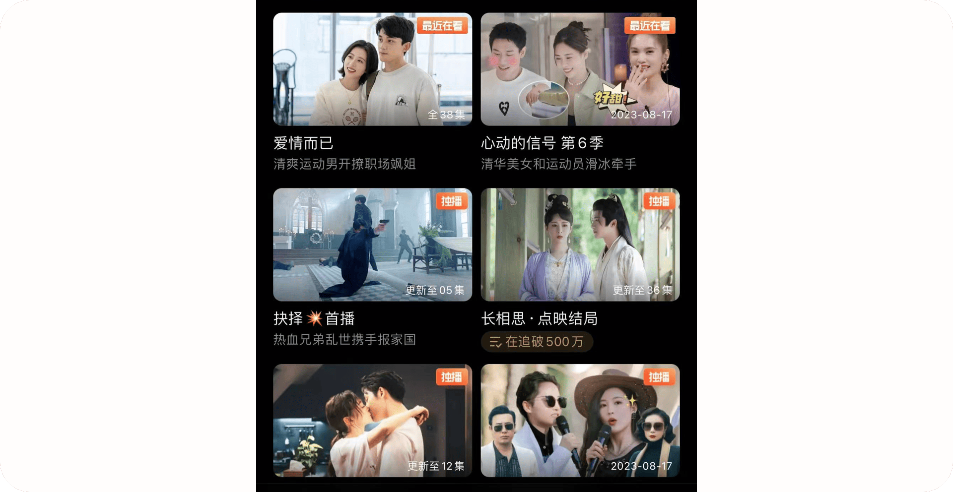 2.2.3產(chǎn)品亮點(diǎn):視頻大卡片推薦這種樣式的推薦形式雖然同屏下相比雙瀑布流的可推薦內(nèi)容少,但可以讓用戶更注重內(nèi)容視頻本身,推薦的視頻內(nèi)容都為該作品的熱門片段,小編經(jīng)??粗粗桶怖艘粋€(gè)新劇,很適合作為長(zhǎng)視頻推薦列表使用