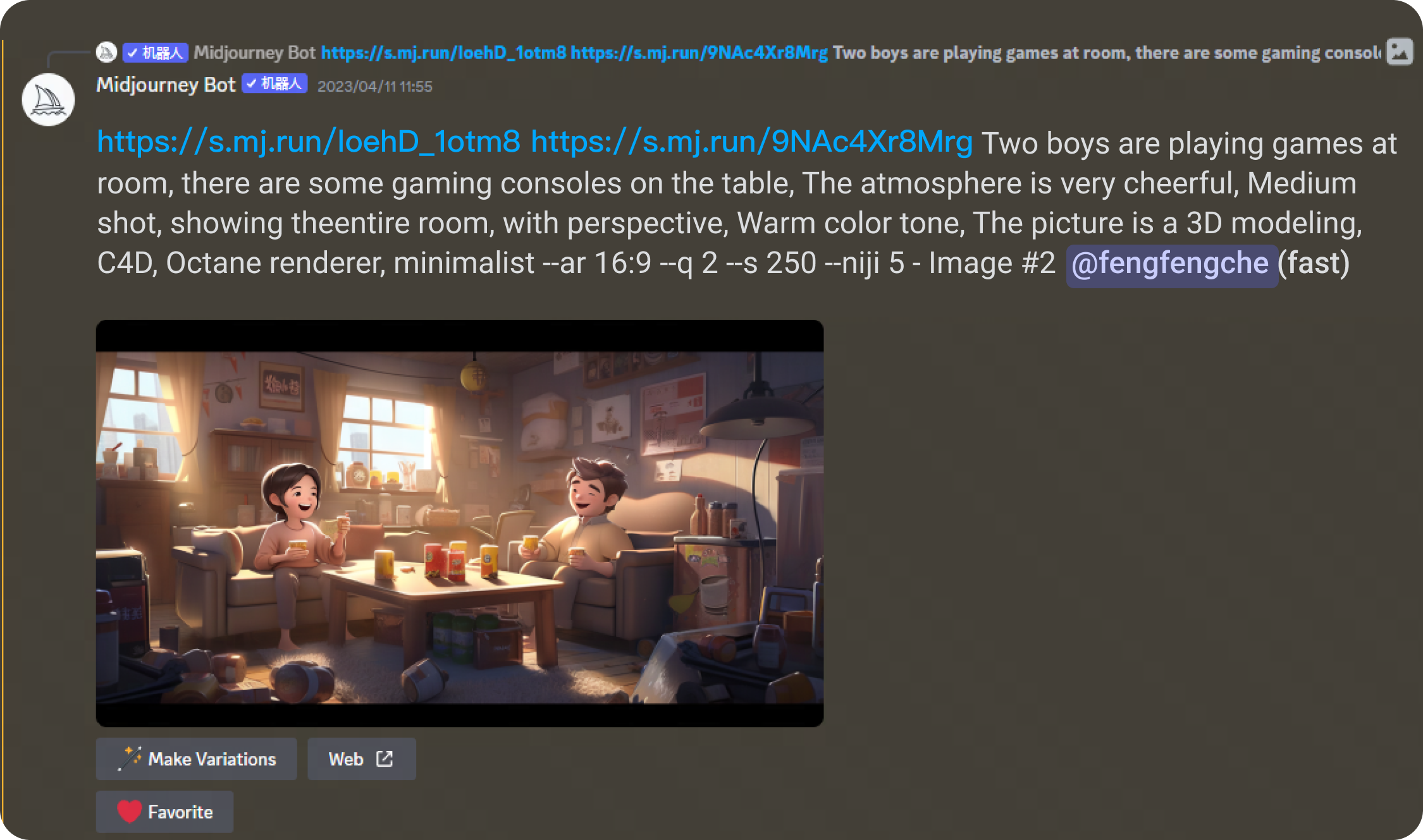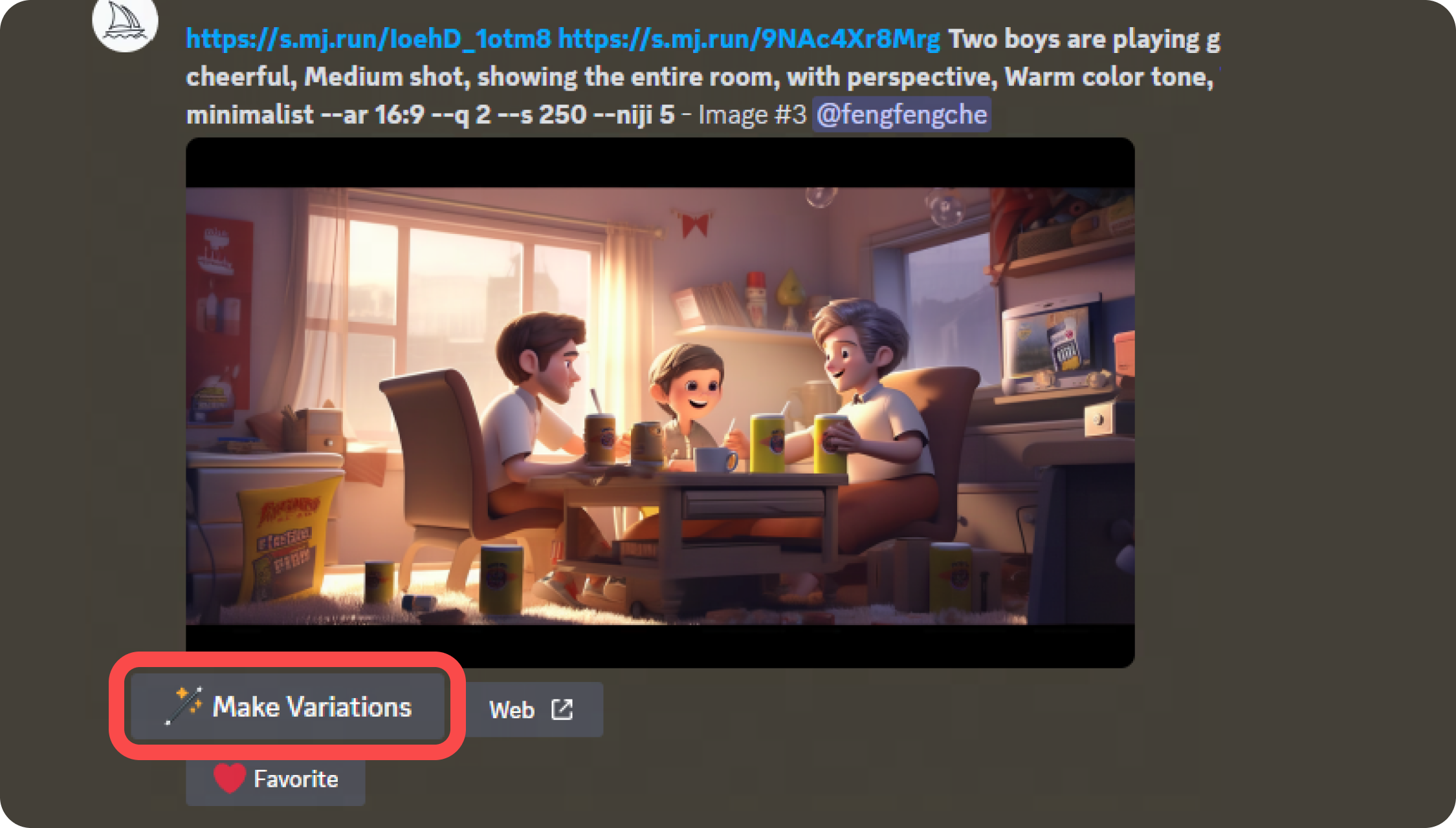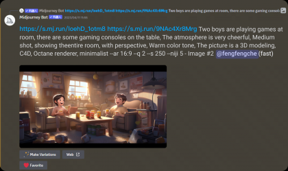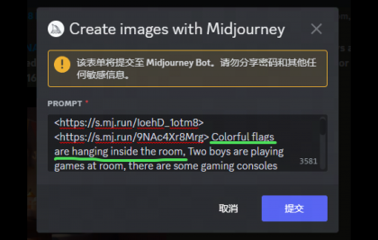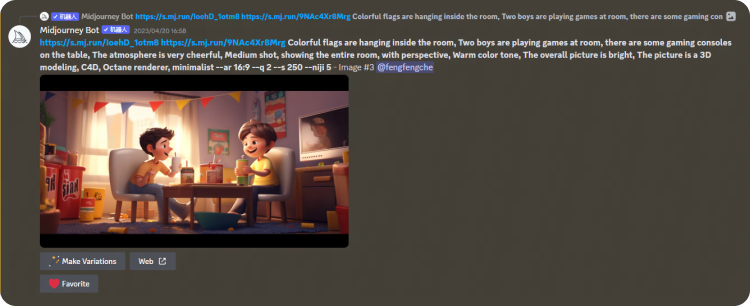 得到這張圖后,覺得畫面左上角部分有些空白,為了襯托歡快聚會(huì)的氛圍,我們決定在左上方加上掛旗。方法也是運(yùn)用Midjourney的混音模式。在關(guān)鍵詞中加入“屋子里掛著彩旗”。