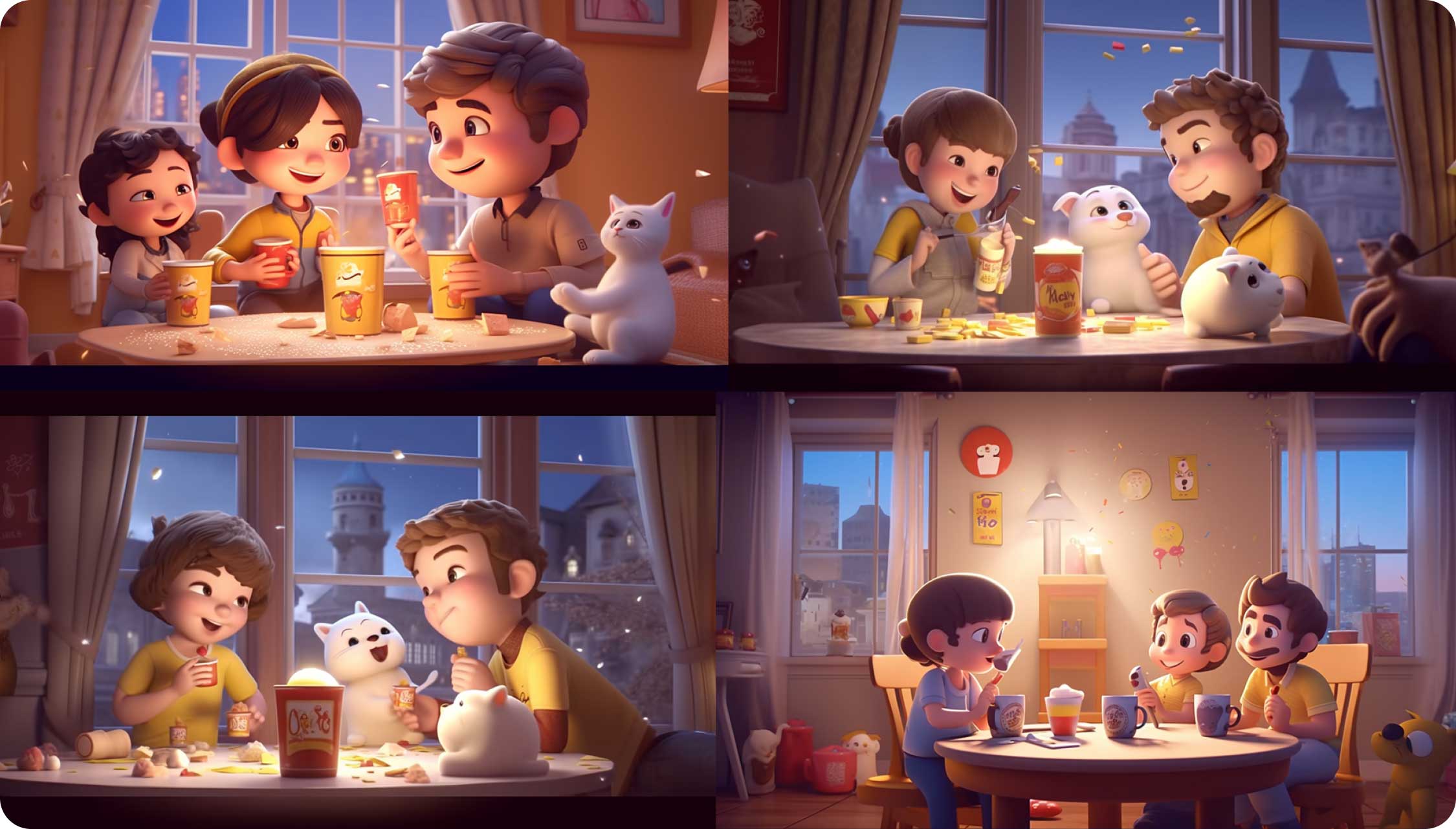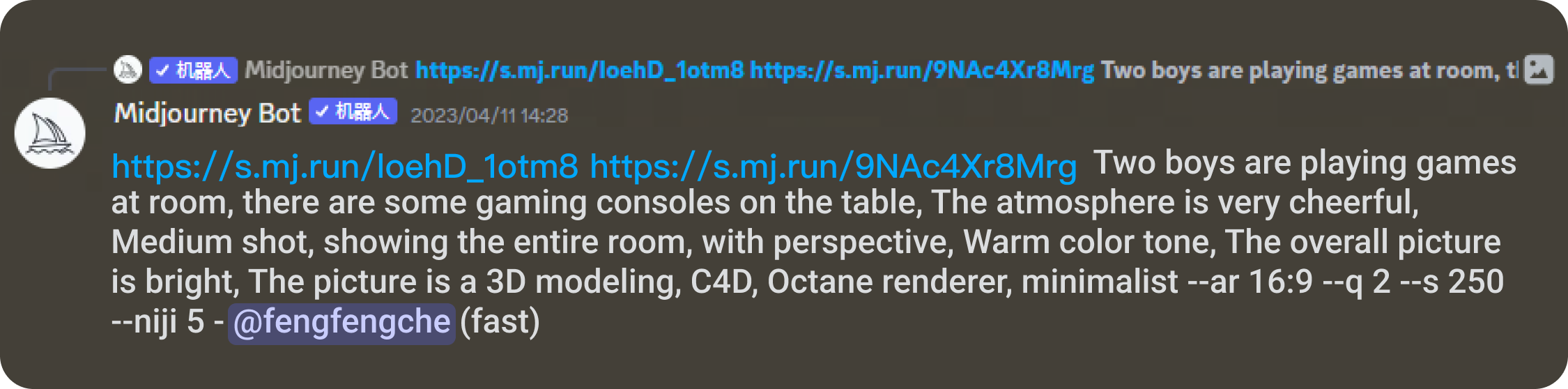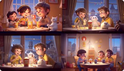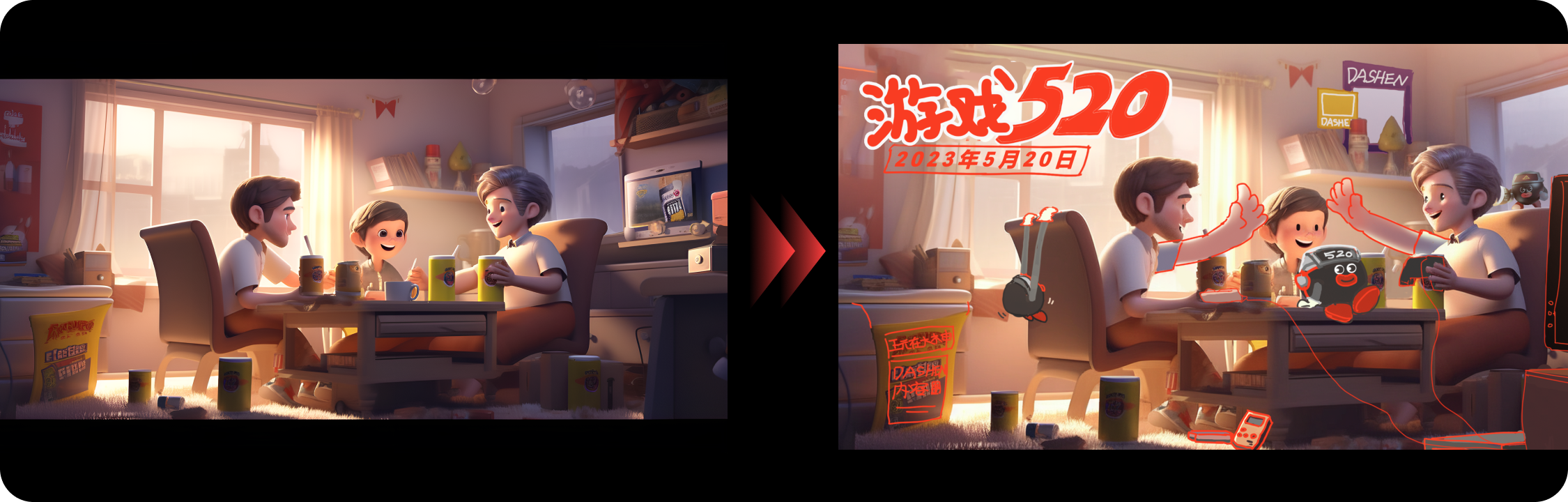 得到這張圖后,覺得畫面左上角部分有些空白,為了襯托歡快聚會(huì)的氛圍,我們決定在左上方加上掛旗。方法也是運(yùn)用Midjourney的混音模式。在關(guān)鍵詞中加入“屋子里掛著彩旗”。