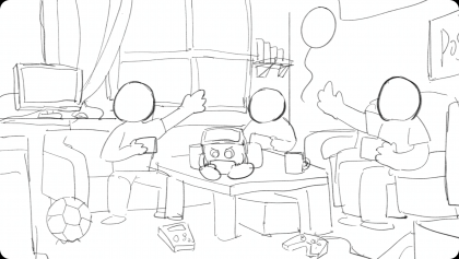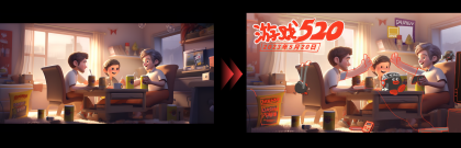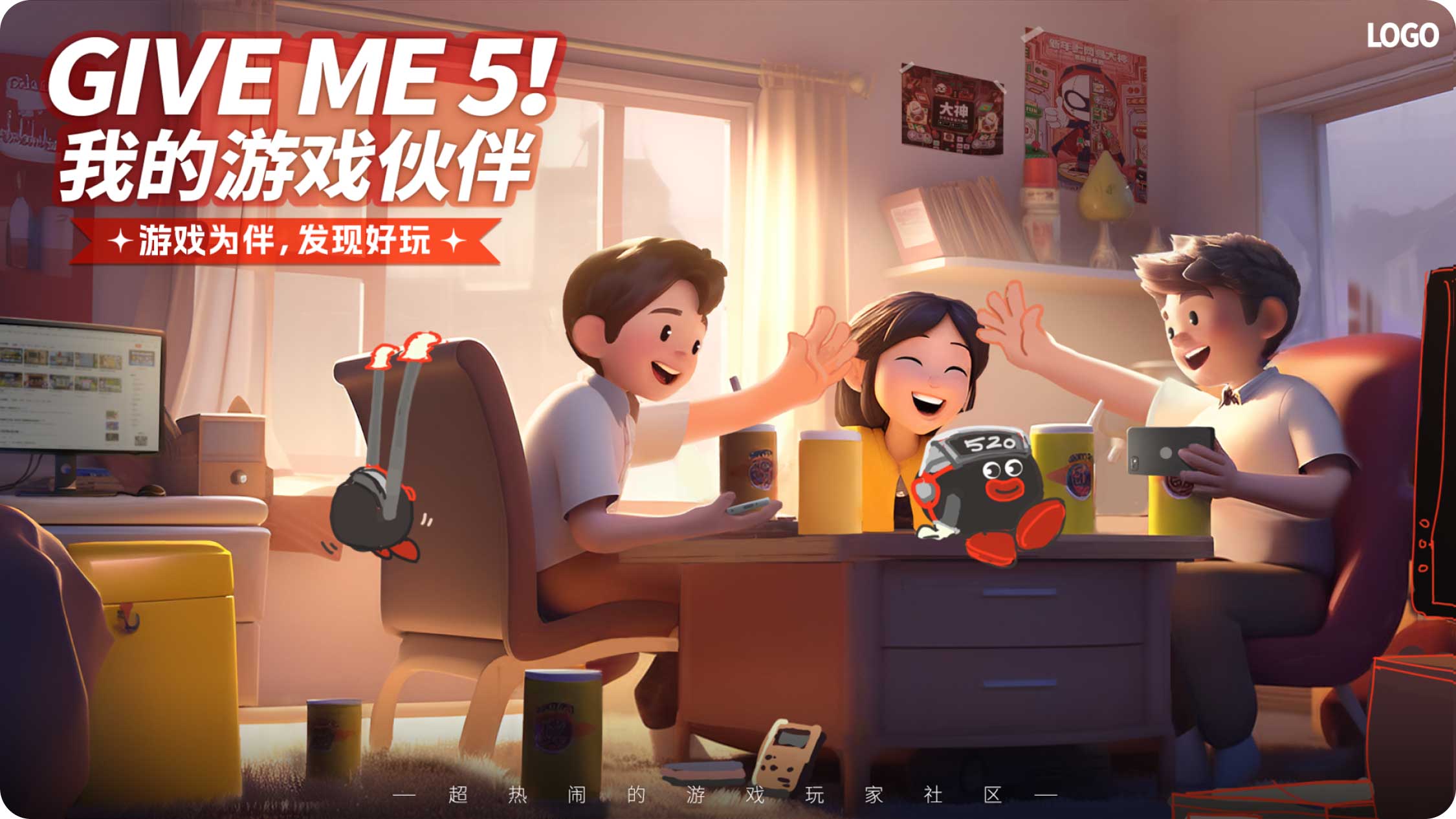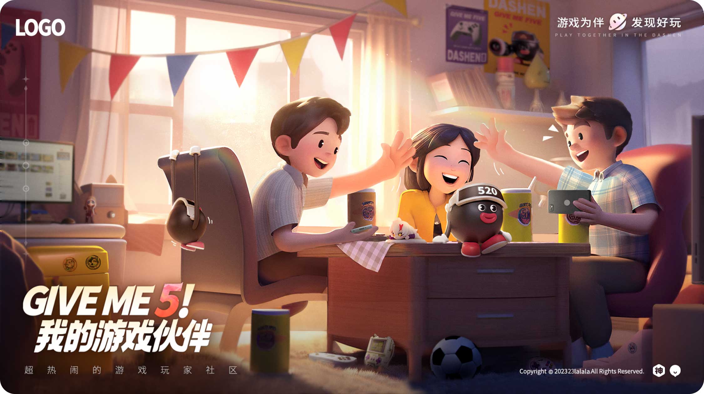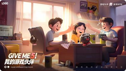 大概描繪了幾個(gè)伙伴在組隊(duì)玩游戲,因?yàn)楂@得了勝利相互擊掌(give me 5)的輕松愉快的畫面。周圍有一些和游戲相關(guān)的元素,IP形象也在畫面中心露出,強(qiáng)調(diào)與品牌之間的關(guān)系。