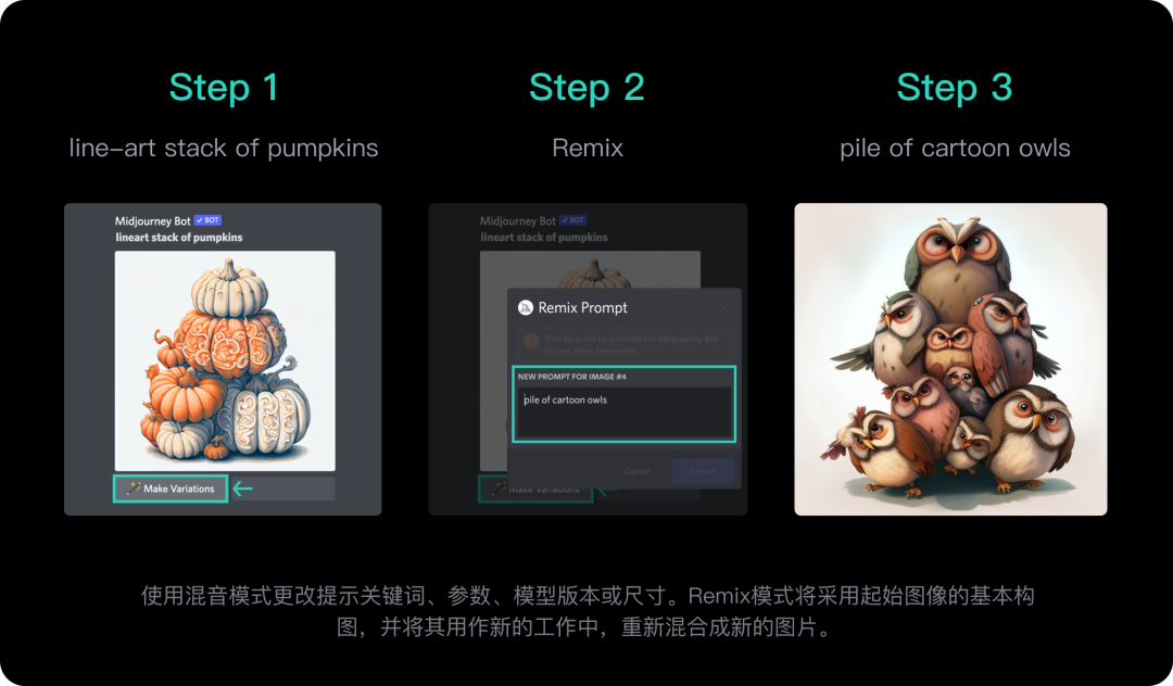 回顧之前《ASAK|全面解析Midjourney參數(shù)和指令》的案例,使用的步驟如下:點(diǎn)擊Make variations,在彈出窗口中修改或輸入新的提示。例如在輸入框里輸入pile of cartoon owls(一堆卡通貓頭鷹)。最終生成的圖片對應(yīng)的貓頭鷹代替南瓜。