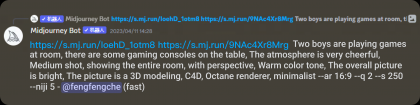 緊接著我們用之前篩選出來的其中一張或多張圖片,在Midjourney中進(jìn)行墊圖,根據(jù)之前所得結(jié)論對關(guān)鍵詞進(jìn)行優(yōu)化,再開始新的一輪煉圖。(關(guān)鍵詞增加了“中景”、“展示整個(gè)房間”、“透視感”、“畫面明亮”。)
