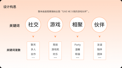 需求方希望畫面能展現(xiàn)出品牌的社交感,以“游戲伙伴”為主題,畫面表達(dá)各種不同類型游戲伙伴,因我們的產(chǎn)品而相聚的場景。同時(shí)希望畫面中的人物能做出擊掌(GIVE ME 5)的動(dòng)作,以此呼應(yīng)品牌發(fā)布會(huì)的主題。