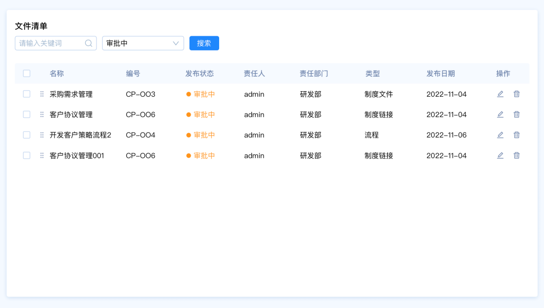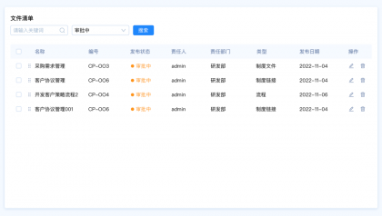 設(shè)計要點:由于這里包含多種篩選類型,名稱和編號是關(guān)鍵詞篩選,發(fā)布狀態(tài)和、責任人、責任部門、類型是選項篩選,發(fā)布日期是時間區(qū)間篩選。所以我們需要采用組合篩選的模式。