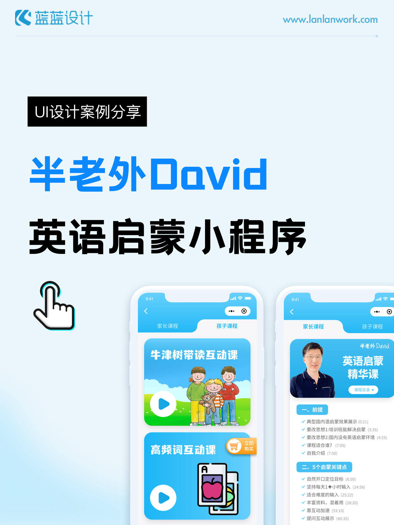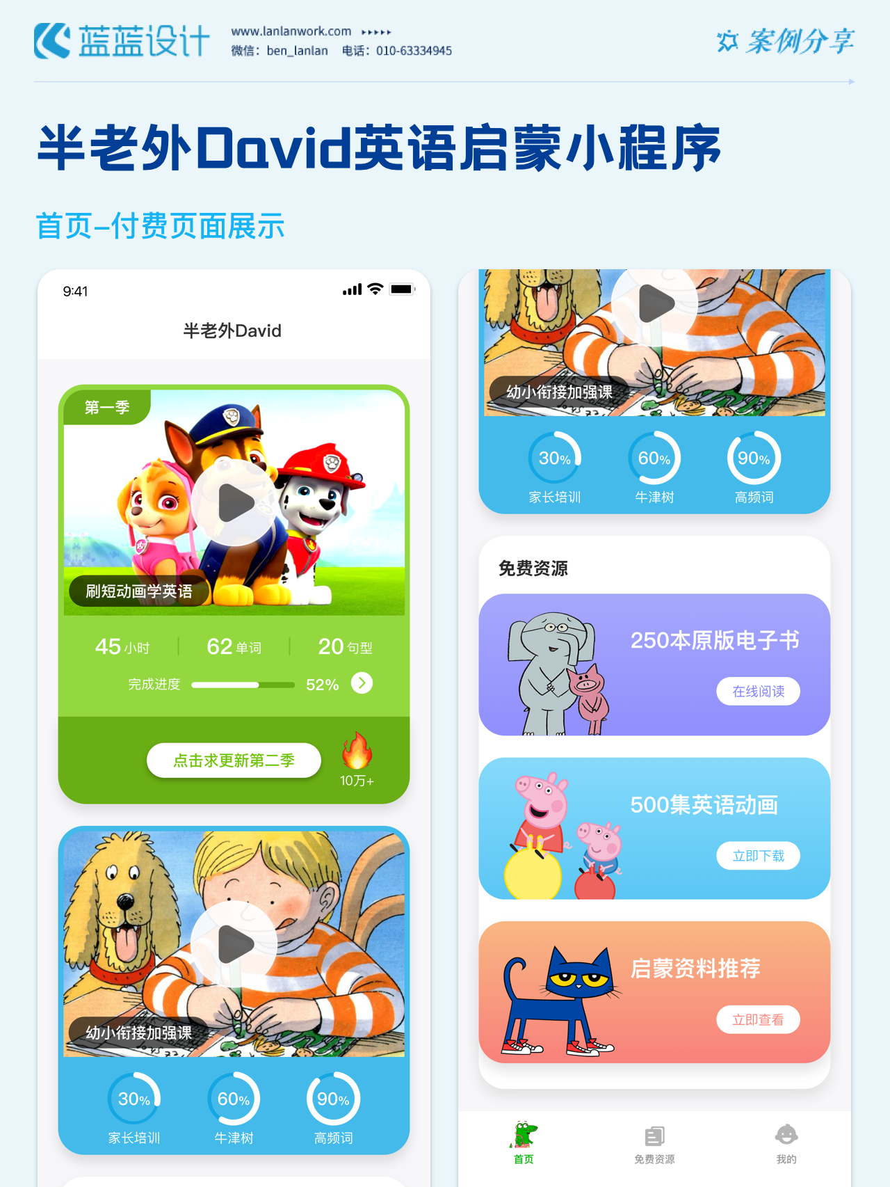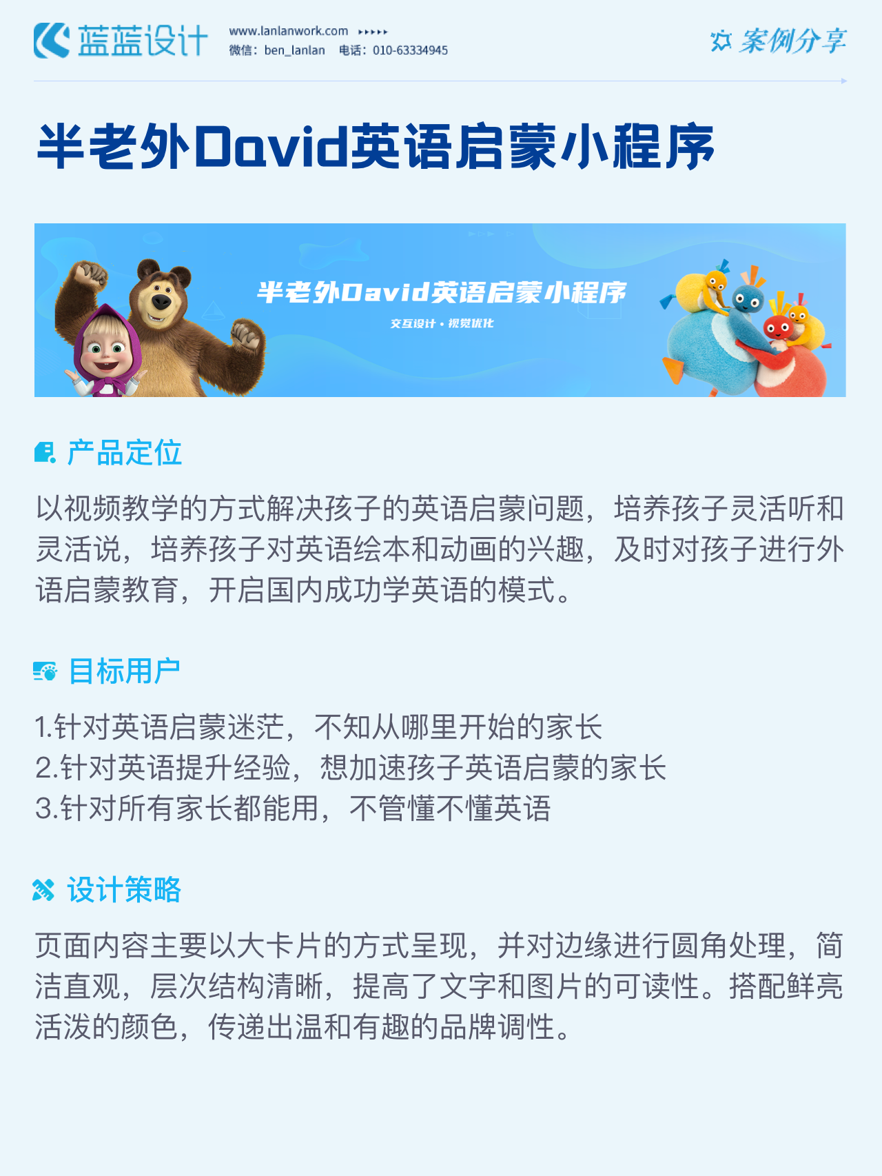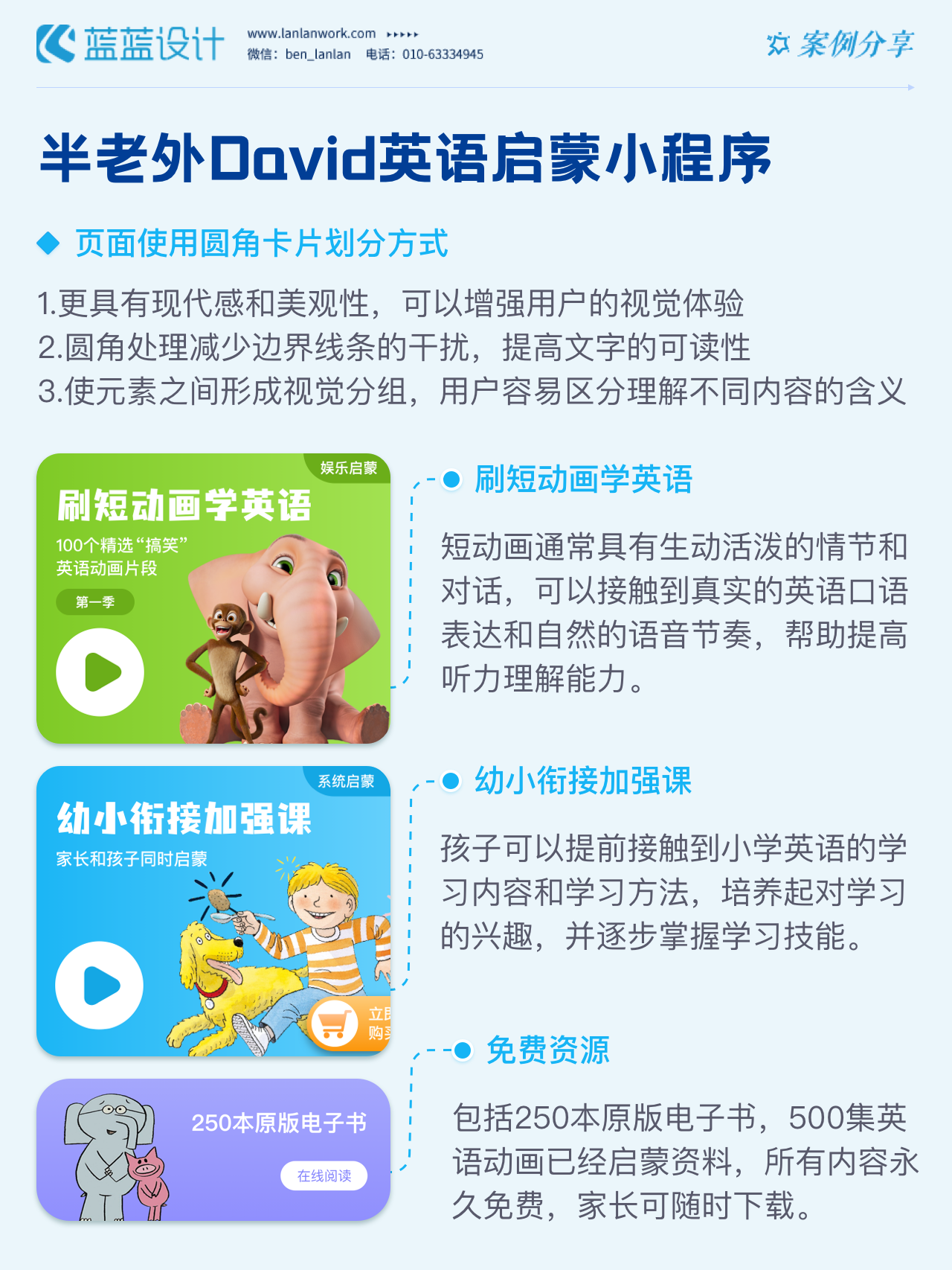 藍藍設計負責半老外David英語啟蒙小程序的界面整體風格和細節(jié)優(yōu)化工作,也包括圖片優(yōu)化等諸多視覺內(nèi)容。前期雙方通過不斷溝通和深入了解最終確定了頁面的風格樣式??匆曨l學英語的方式更容易為孩子所接受,頁面的簡潔風格和顏色應用更加吸引兒童。