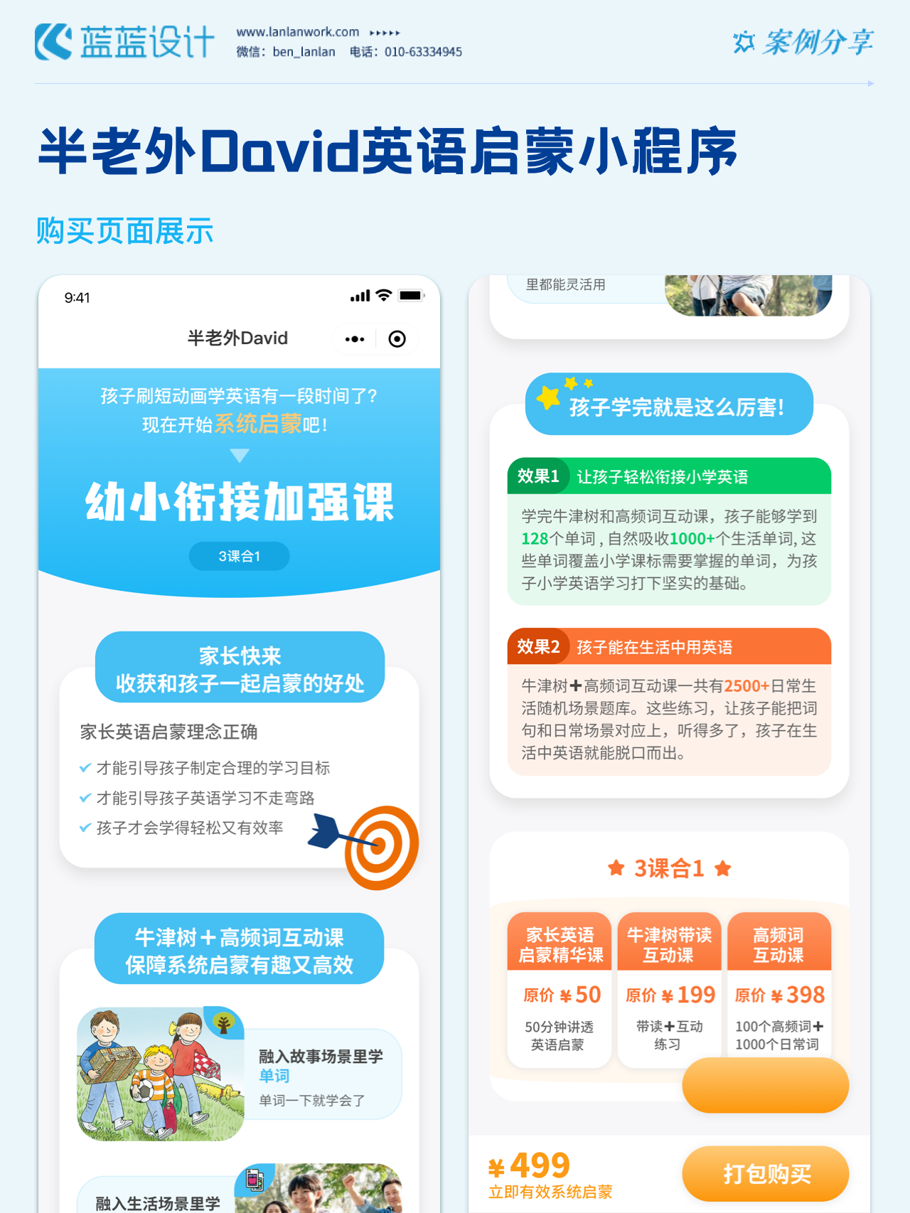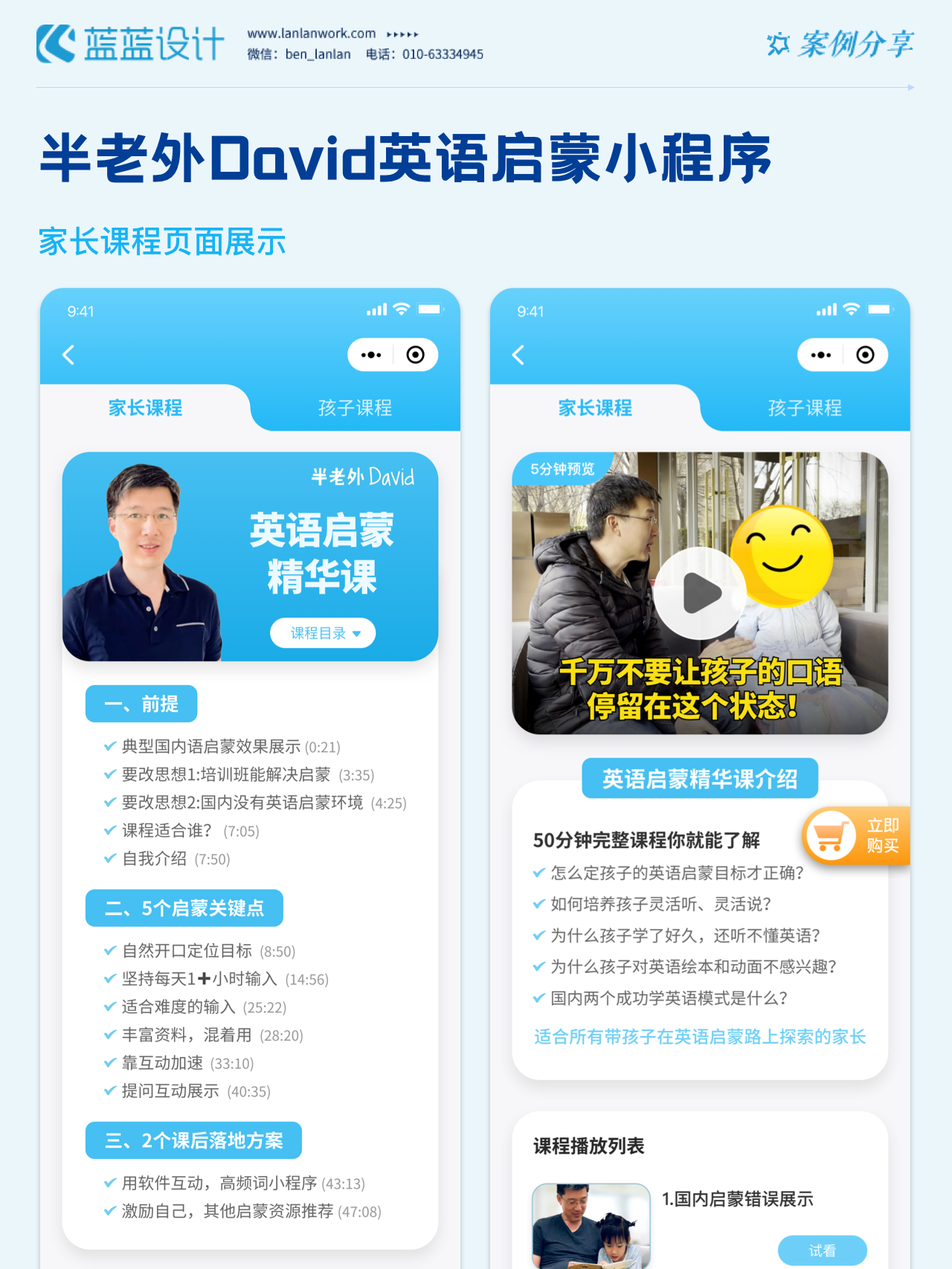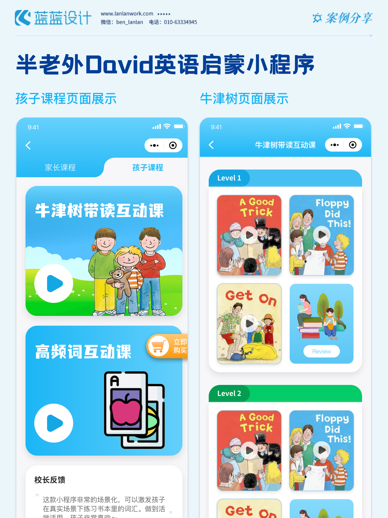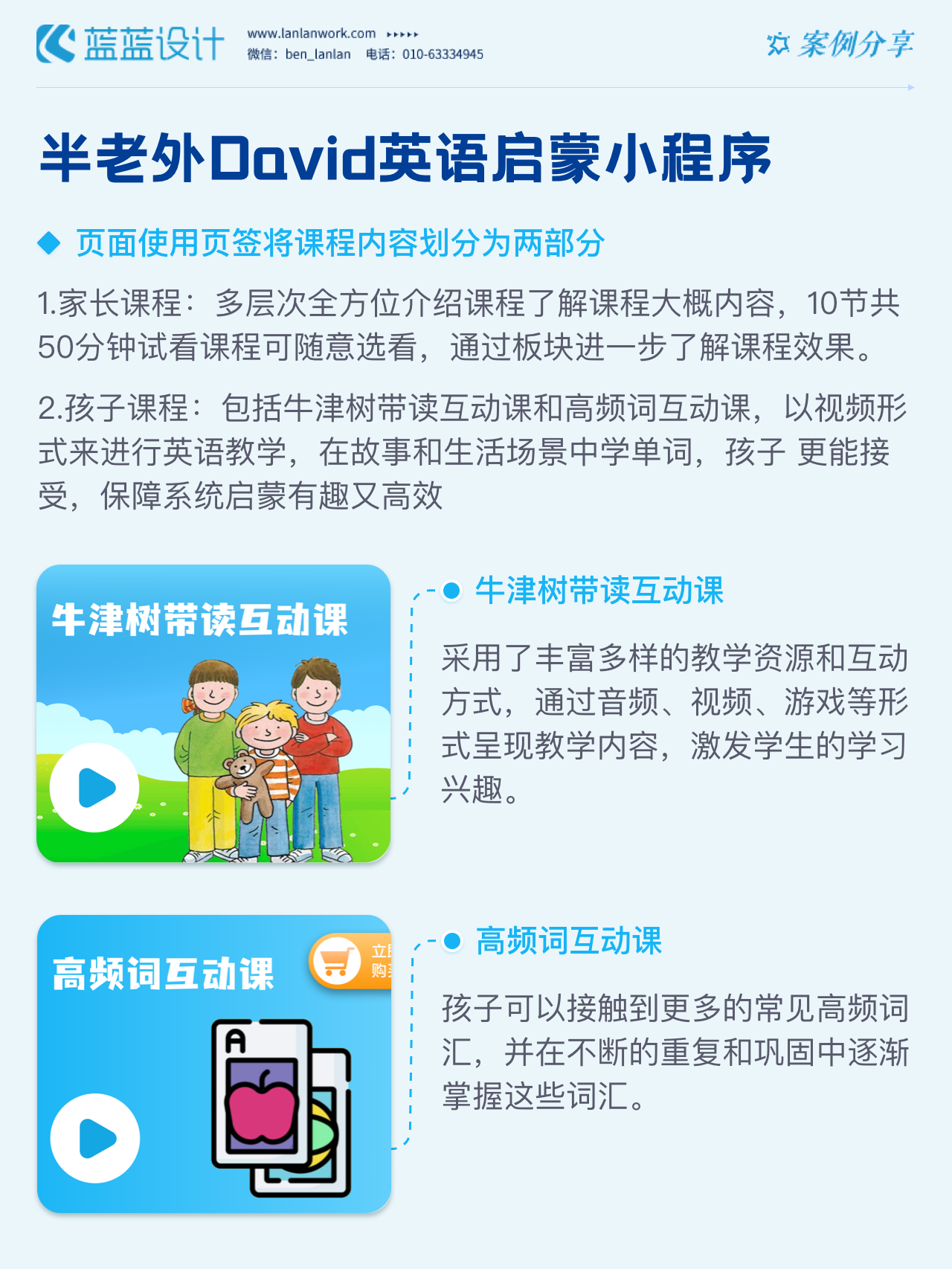 藍藍設計負責半老外David英語啟蒙小程序的界面整體風格和細節(jié)優(yōu)化工作,也包括圖片優(yōu)化等諸多視覺內(nèi)容。前期雙方通過不斷溝通和深入了解最終確定了頁面的風格樣式??匆曨l學英語的方式更容易為孩子所接受,頁面的簡潔風格和顏色應用更加吸引兒童。