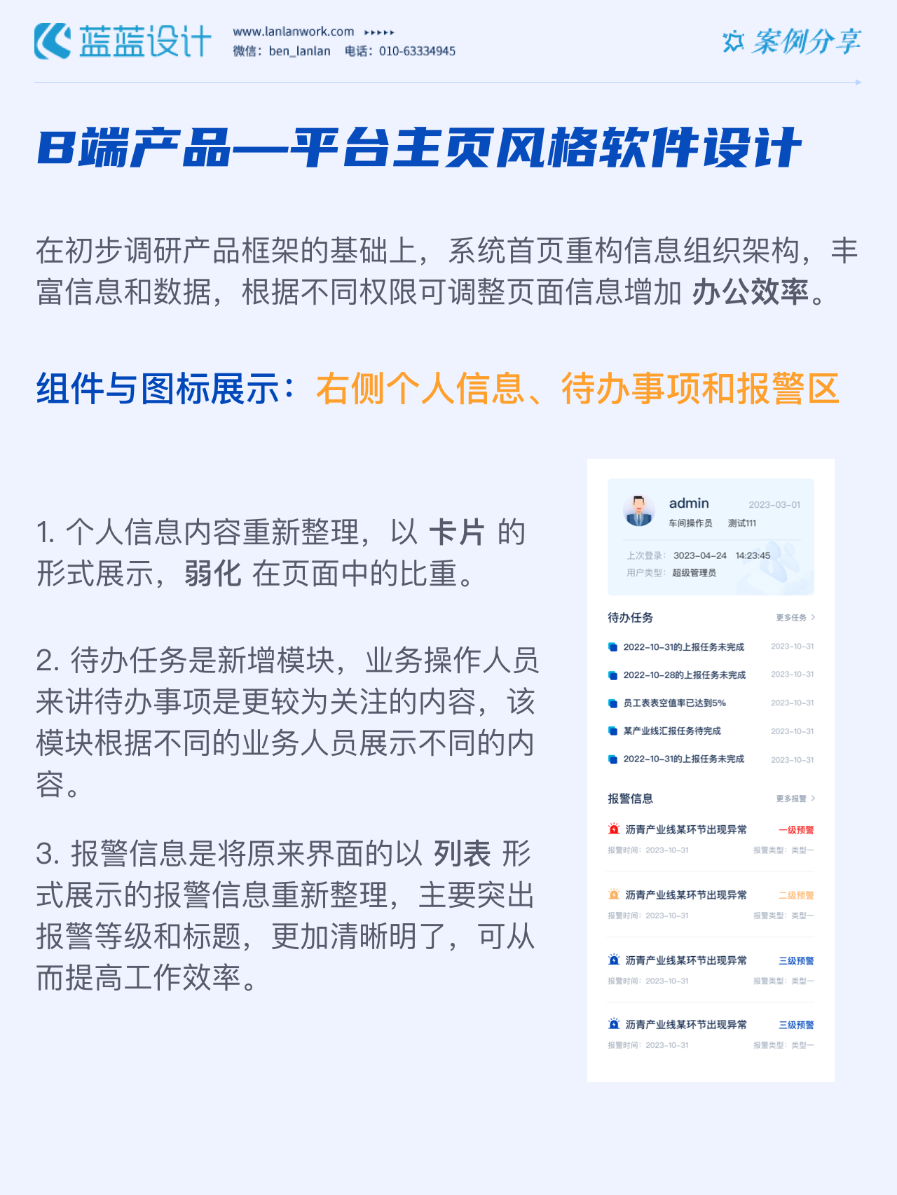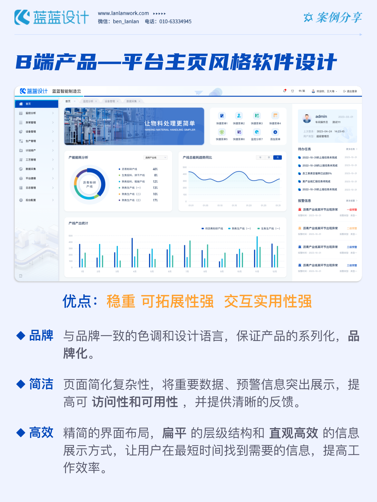 方案二:平臺主頁風(fēng)格 在初步調(diào)研產(chǎn)品框架的基礎(chǔ)上,系統(tǒng)首頁重構(gòu)信息組織架構(gòu),豐富信息和數(shù)據(jù),根據(jù)不同權(quán)限可調(diào)整頁面信息增加辦公效率。設(shè)計風(fēng)格采用簡約的設(shè)計語言,模塊化布局,方圓并構(gòu)的設(shè)計模式,界面強調(diào)可復(fù)用性和通用性,配色采用品牌色,品牌融合度高。