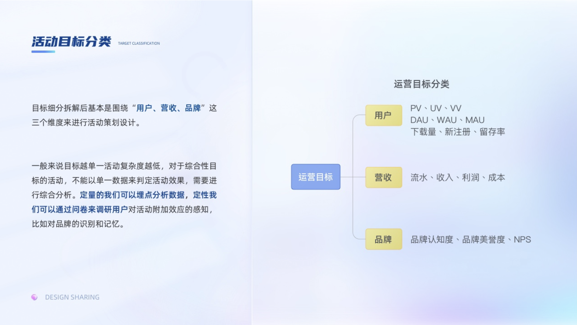 目標的細分拆解后,基本都是圍繞“用戶、營收、品牌”這三個維度來進行活動策劃設計。一般來說目標越單一活動復雜度越低,目標綜合性越高,越需要調動不同類型用戶參與,活動的復雜度就越高。對于綜合性目標的活動,不能以單一數(shù)據(jù)來判定活動效果,需要進行綜合分析。定量的我們可以埋點分析數(shù)據(jù),定性我們可以通過問卷來調研用戶對活動附加效應的感知,比如對品牌的識別和記憶以及NPS(凈推薦值)。