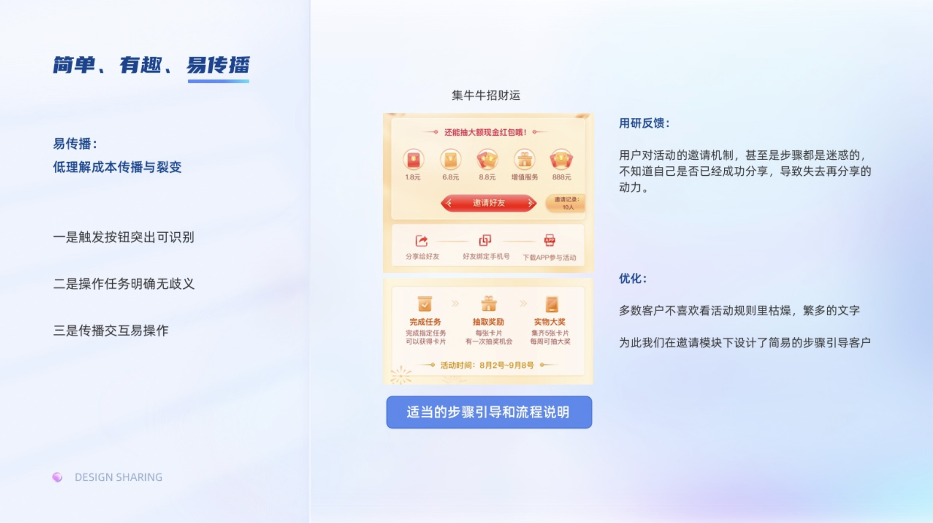 易傳播:是指低理解成本傳播與裂變。一是觸發(fā)按鈕突出可識別;二是操作任務明確無歧義;三是傳播交互易操作。通常我們設計的時候會理所當然感覺用戶是很明確他們的操作行為的,但是基于某證券一期的活動用研反饋,用戶對活動的邀請機制,甚至是步驟都是迷惑的,不知道自己是否已經(jīng)成功分享,導致失去再分享的動力,為此我們在邀請模塊下設計了簡易的步驟去引導客戶。