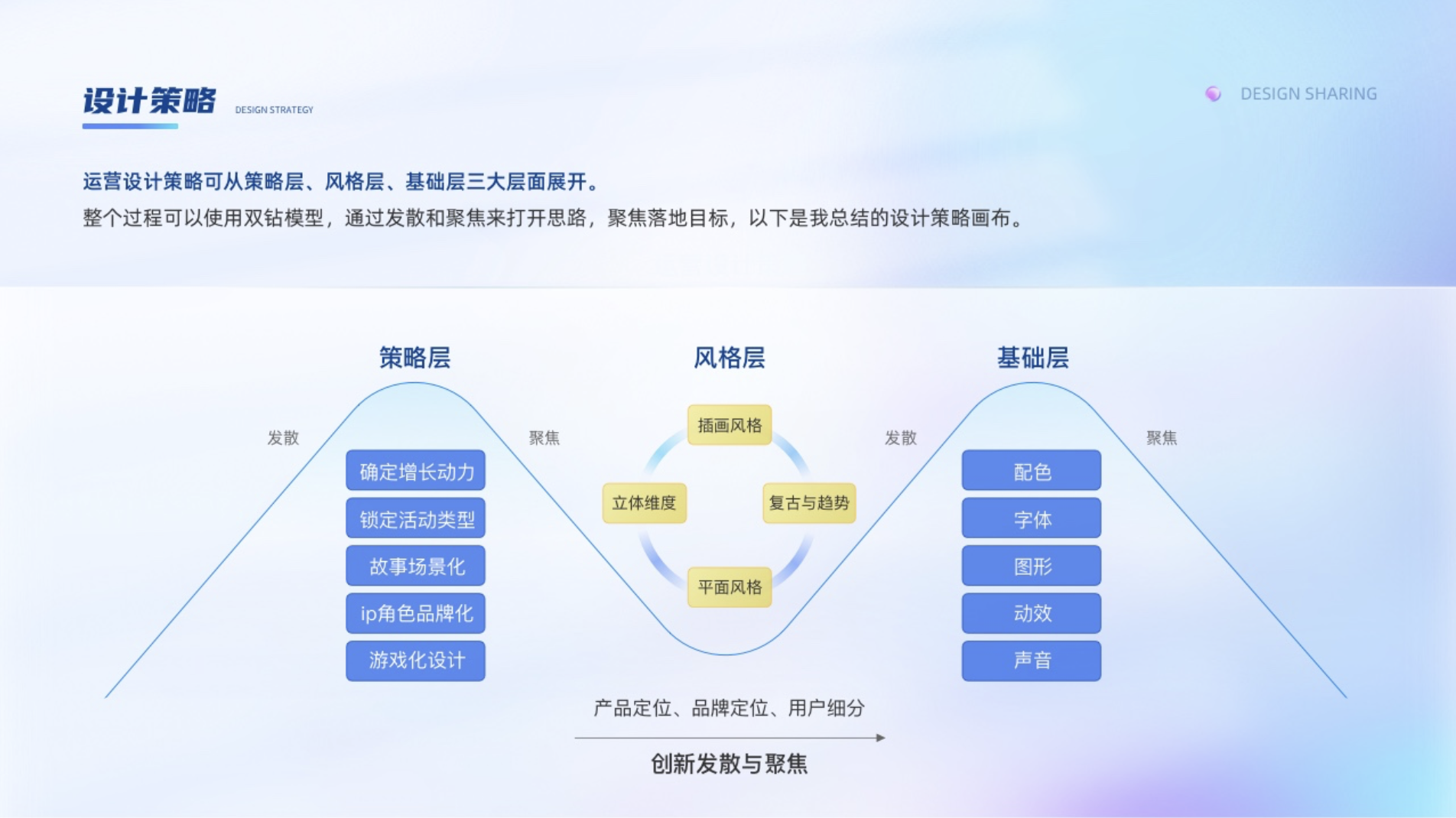 運營設計策略可從策略層、風格層、基礎層三大層面展開。整個過程可以使用雙鉆模型,通過發(fā)散和聚焦來打開思路,聚焦落地目標,以下是我總結的設計策略畫布。