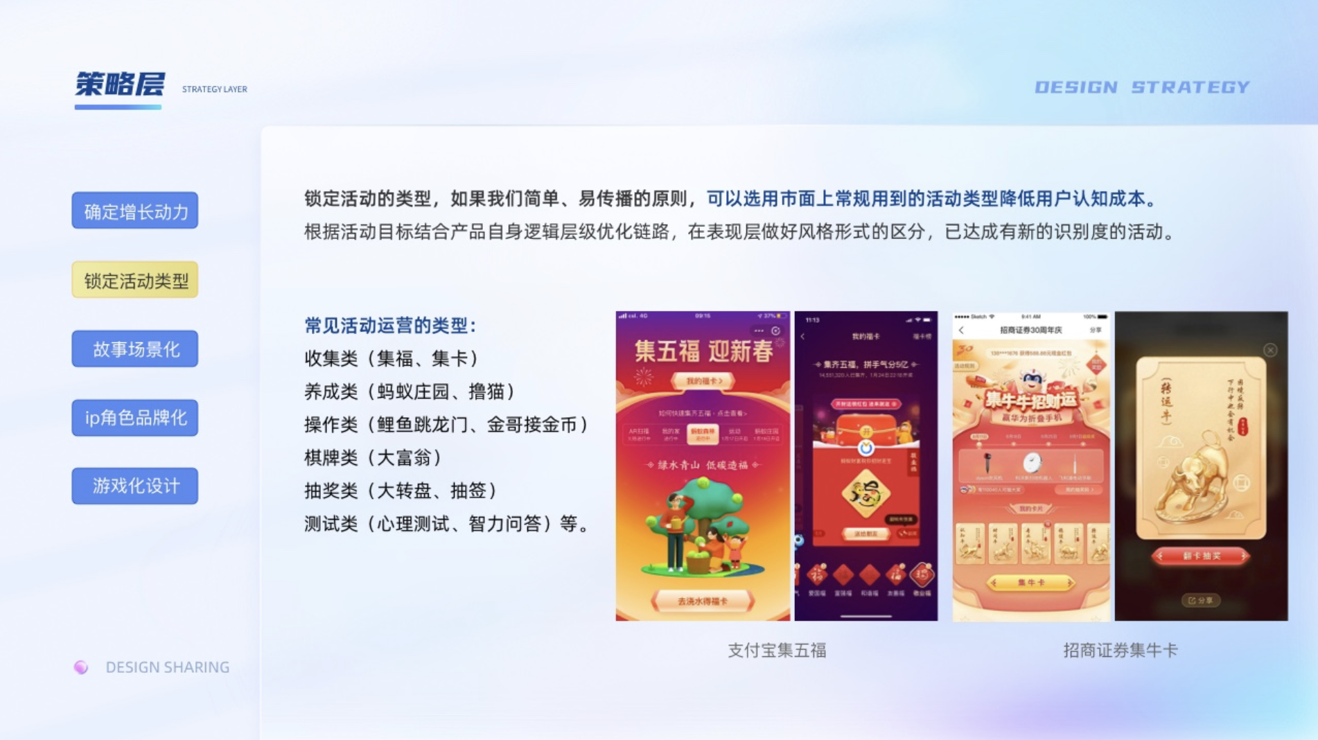 確定增長動力后,需要鎖定活動的類型。如果我們簡單、易傳播的原則,可以選用市面上常規(guī)用到的活動類型降低用戶認知成本,對于一些比較有名的活動,像支付寶集五福,其本質就是通過完成運營任務來收集某種虛擬物品,再由集齊的虛擬物品變現(xiàn)紅包完成用戶利益激勵。設計時不能完全照搬,既要根據(jù)活動目標結合產(chǎn)品自身邏輯層級優(yōu)化鏈路,也要在表現(xiàn)層做好風格形式的區(qū)分,已達成有新的識別度的活動。