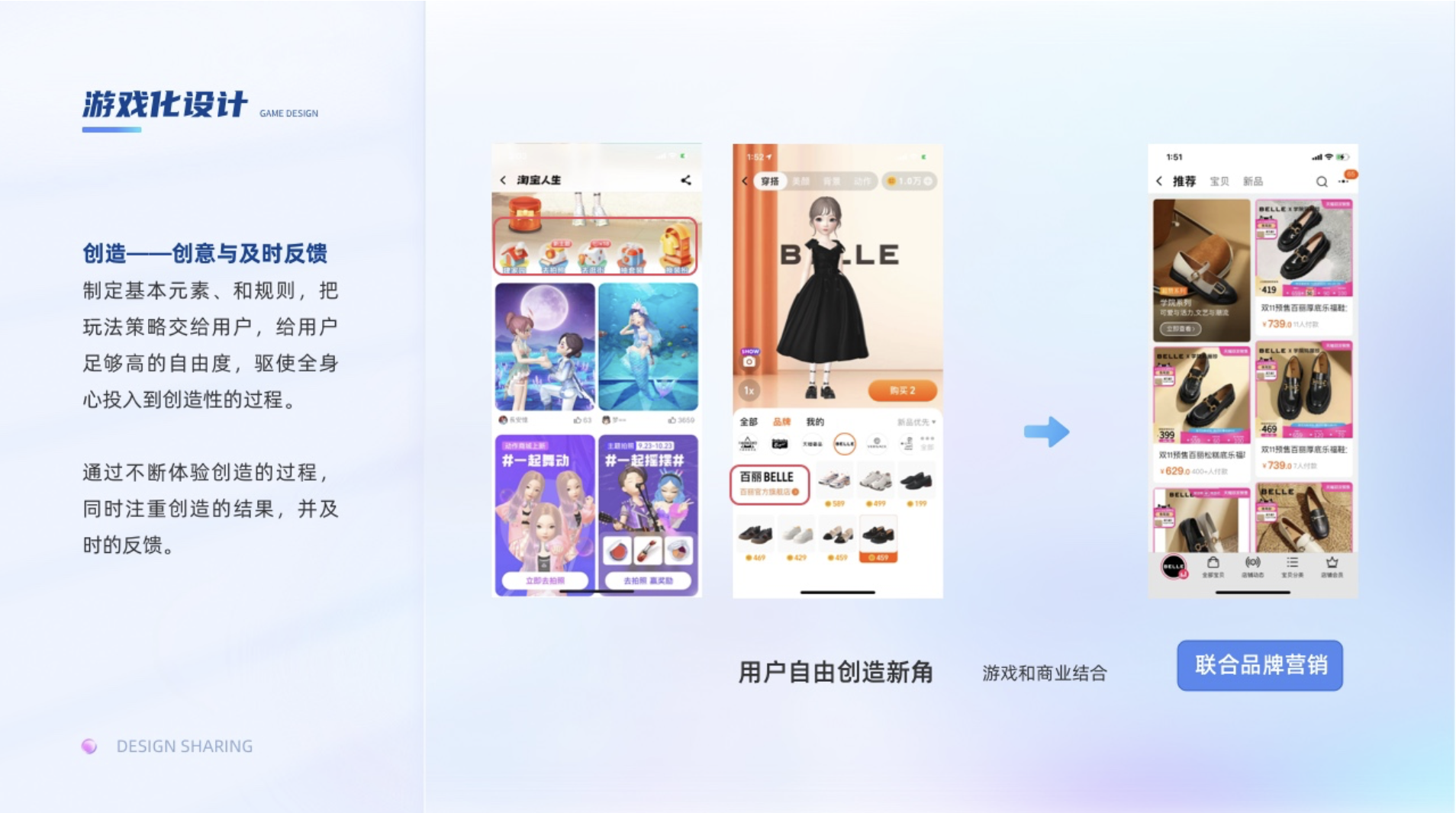 制定基本元素、和規(guī)則,把玩法策略交給用戶,給用戶足夠高的自由度,驅使全身心投入到創(chuàng)造性的過程。通過不斷體驗創(chuàng)造的過程,同時注重創(chuàng)造的結果,并及時的反饋。比如淘寶人生,可以打造自己的形實質上就是裝扮類的游戲,這種常駐型的游戲,不僅可以提高用戶使用產(chǎn)品的時長,還可以聯(lián)動品牌做營銷提高下單率。其生命力的不竭動力就源于,對用戶不斷提供創(chuàng)新的服裝、妝容、飾品、場景,讓用戶自由創(chuàng)造新角。