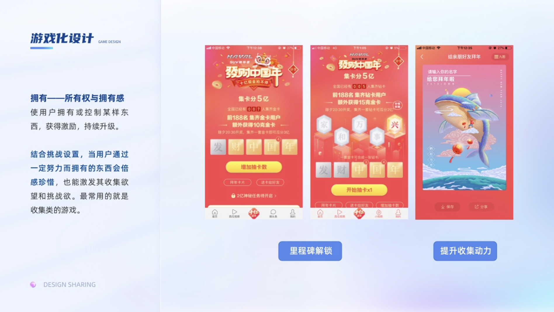 使用戶擁有或控制某樣東西,獲得激勵,持續(xù)升級。結合挑戰(zhàn)設置,當用戶通過一定努力而擁有的東西會倍感珍惜,也能激發(fā)其收集欲望和挑戰(zhàn)欲。最常用的就是收集類的游戲,比如各種收集類的活動中,先會獲得一個物品激發(fā)你對該系列的占有欲,不斷收集其他款。還有一種常用的是勛章的激勵,勛章本身是對行為的階段性的獎勵,好的策略和勛章樣式同樣能激發(fā)用戶的收集欲。