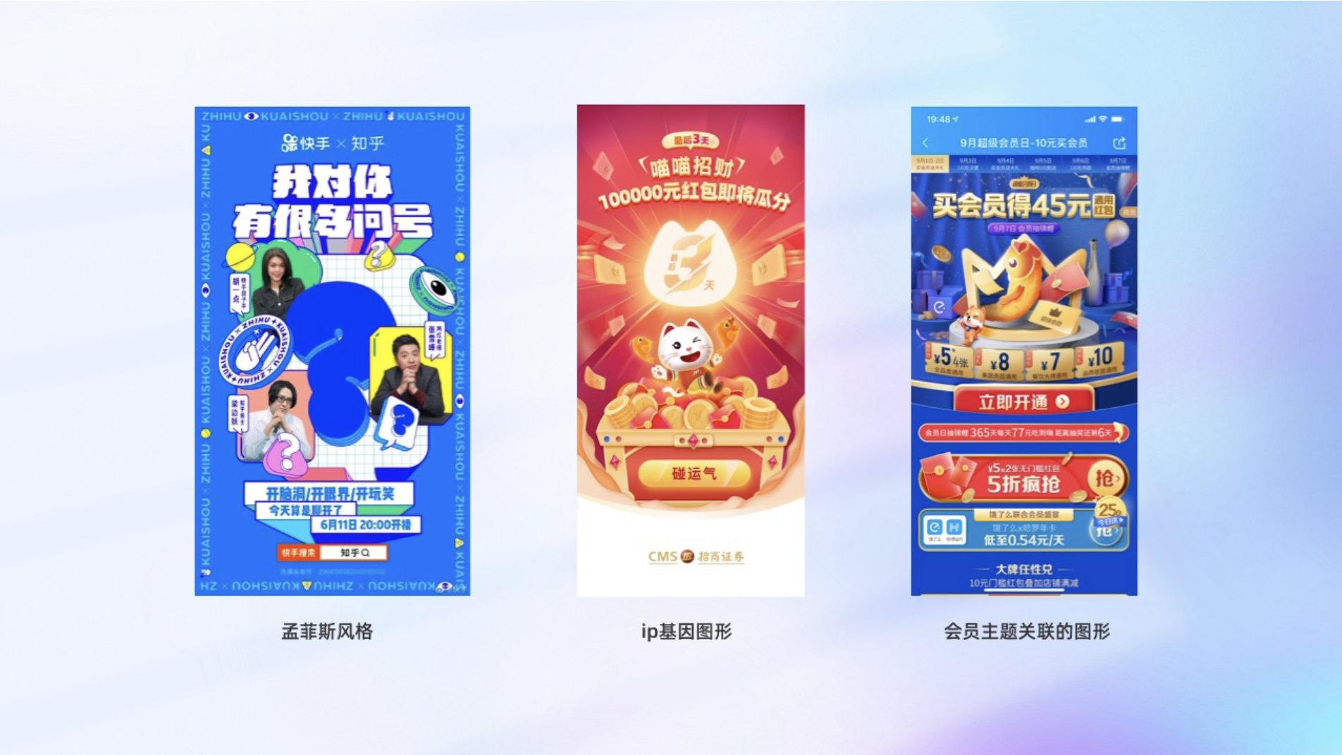 圖形:圖形分為大塊面圖形和點綴性圖形,大塊面的圖形使用可以很好的起到第一眼營銷的作用,比較適合創(chuàng)意圖形;點綴性圖形比較適合提升活動的氛圍,提升局部的質感,還可以給人一種潤物細無聲的精細感。
