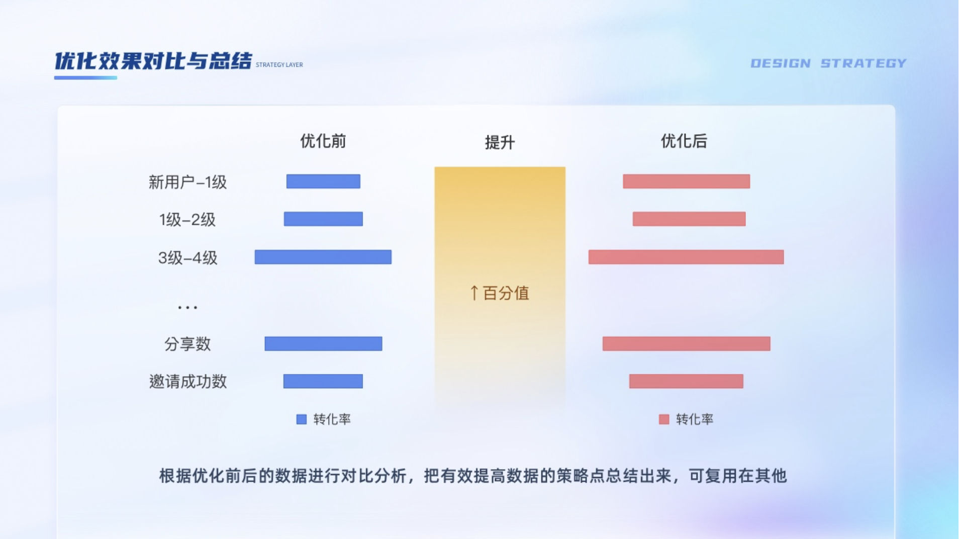 根據(jù)優(yōu)化前后的數(shù)據(jù)進行對比分析,把有效提高數(shù)據(jù)的策略點總結出來,可復用在其他項目。