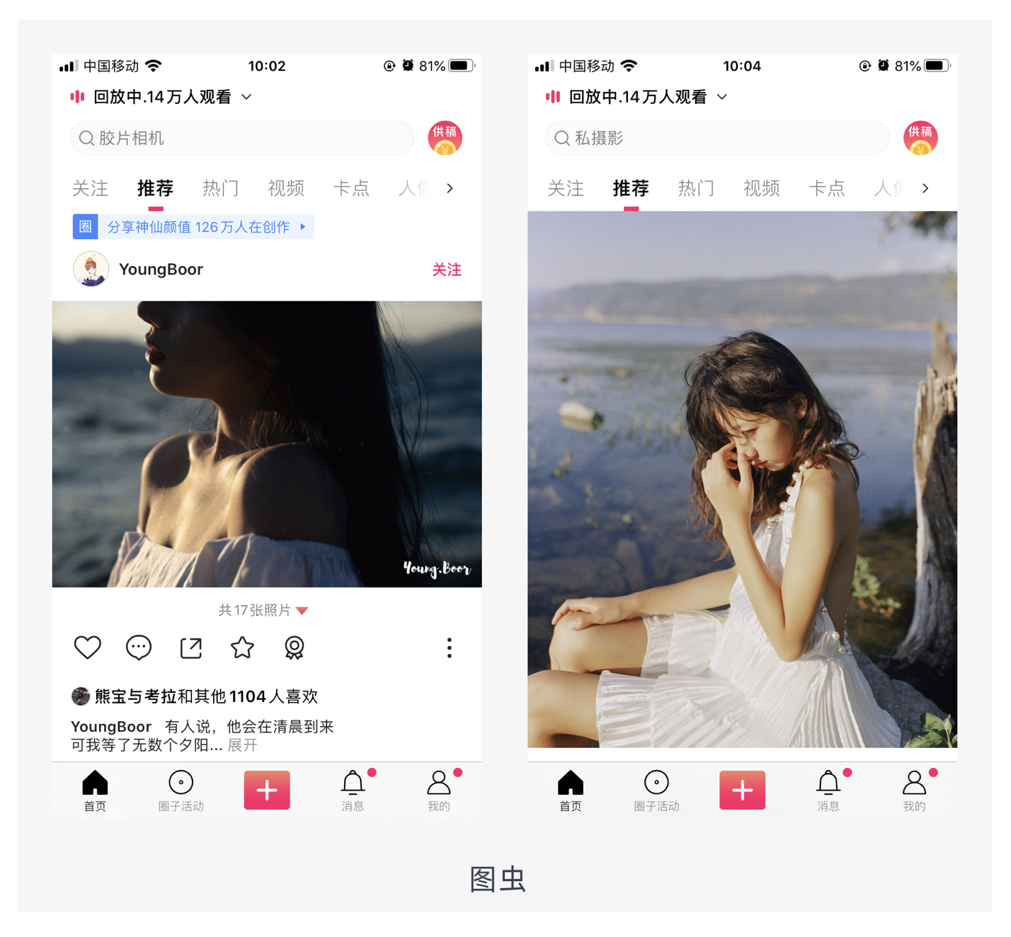- 隨圖片而變化:當(dāng)用戶上傳不同比例的圖片時(shí),圖片展示寬度為屏幕寬度,展示高度根據(jù)確定的寬度等比例縮放。這種適配方式能將圖片信息表達(dá)完善,但圖片占用空間大,適合圖片質(zhì)量高、用戶以瀏覽圖片為主的產(chǎn)品,如圖蟲。不過需要注意的是,采用該方式需要設(shè)置最大最小閾值,當(dāng)圖片的高度超過一定數(shù)值,高度就不再增加,當(dāng)圖片的高度小于一定數(shù)值,高度不再減小。