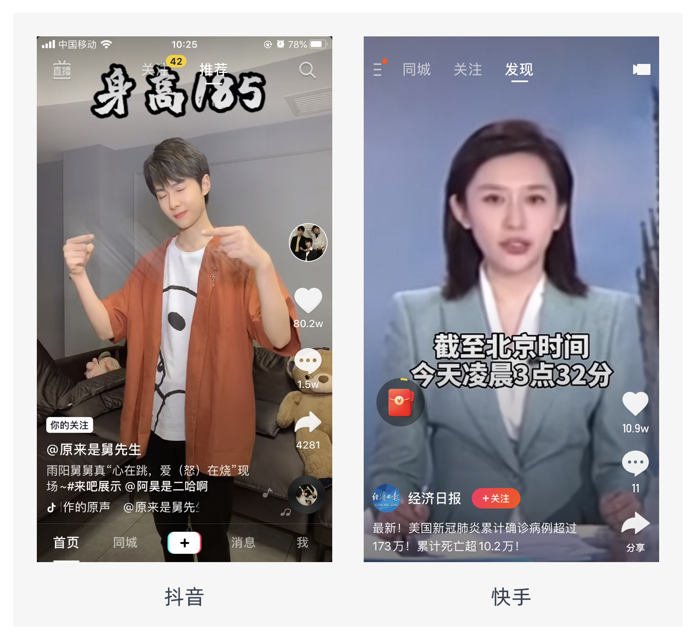 視頻性 Feed 流以短視頻為主(長(zhǎng)視頻占用用戶時(shí)間長(zhǎng),容易導(dǎo)致用戶缺乏耐心),搭配輔助文字。它的優(yōu)點(diǎn)是能滿足用戶在視覺和聽覺上的感受,沉浸式體驗(yàn)好,更加容易吸引用戶的注意力,一般情況下會(huì)主動(dòng)且循環(huán)播放,畫面占滿全屏,如快手、抖音、微視等。不過,它也存在缺點(diǎn),占用空間大,展示內(nèi)容少,而且需要緩存,對(duì)網(wǎng)絡(luò)質(zhì)量要求高。