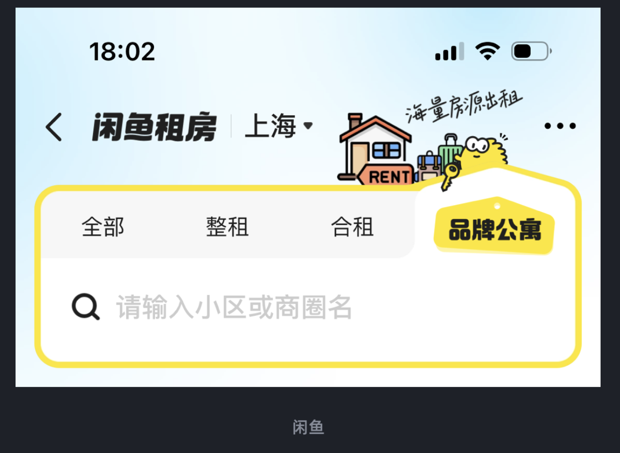 傳統(tǒng)租房板塊多以 “文字 + 普通卡片” 呈現(xiàn),用戶需先讀文字才能識(shí)別功能;閑魚則直接將 “房屋結(jié)構(gòu)” 轉(zhuǎn)化為視覺符號(hào) —— 卡片上用簡化的房屋輪廓圖標(biāo)替代傳統(tǒng)標(biāo)簽,配合 “RENT” 英文標(biāo)識(shí),讓用戶一眼就能關(guān)聯(lián) “租房” 業(yè)務(wù)。這種設(shè)計(jì)不僅強(qiáng)化了業(yè)務(wù)屬性,還通過圖形化降低了信息識(shí)別成本,同時(shí)獨(dú)特的視覺符號(hào)也加深了用戶對(duì)產(chǎn)品的記憶度。