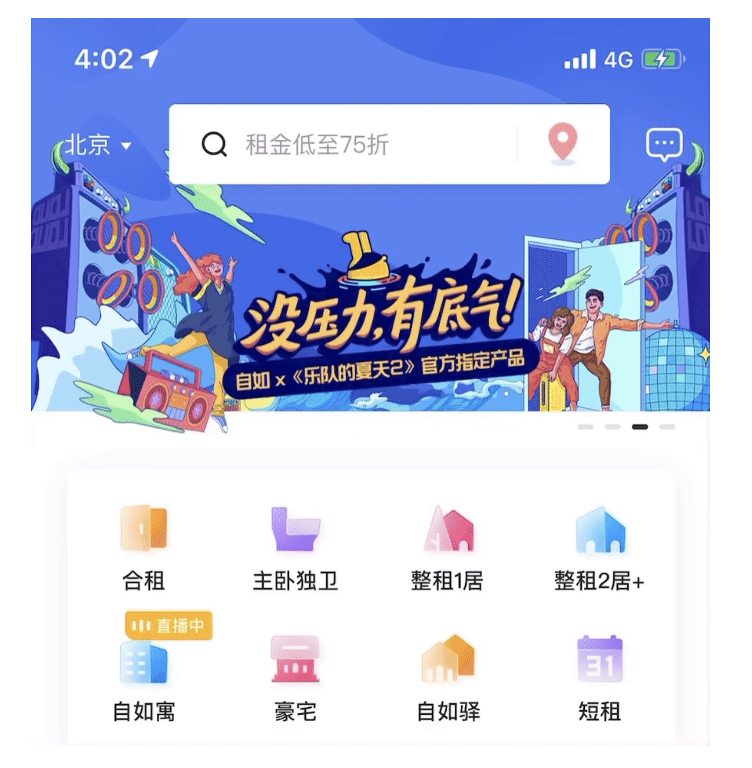 通欄 Banner 是首屏的 “???rdquo;—— 它占據(jù)整個(gè)頁面寬度,視覺沖擊力強(qiáng),適合傳遞單一、重要的信息,比如產(chǎn)品的年度活動(dòng)、核心功能更新。以自如的首頁 Banner 為例,通欄設(shè)計(jì)搭配 “租金低至 75 折” 的大標(biāo)題,配合分層視覺效果,瞬間抓住用戶對(duì) “優(yōu)惠” 的注意力;再如工具類 APP 的 “版本更新” Banner,通欄布局讓 “立即升級(jí)” 的入口更突出,降低用戶操作成本。