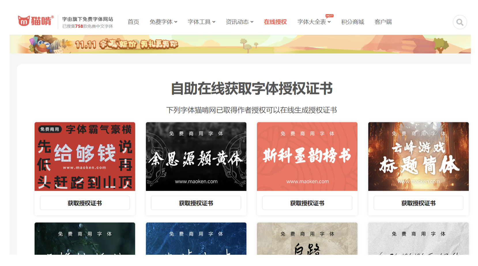 網(wǎng)站界面簡潔,字體分類清晰,每款字體都明確標注授權信息,可直接下載本地使用,也能關聯(lián)字由客戶端一鍵應用。更貼心的是,部分熱門字體支持在線開具授權證書,面對客戶的版權審核需求時能直接拿出證明,預算有限又追求設計質(zhì)感的話,這里絕對值得深挖。