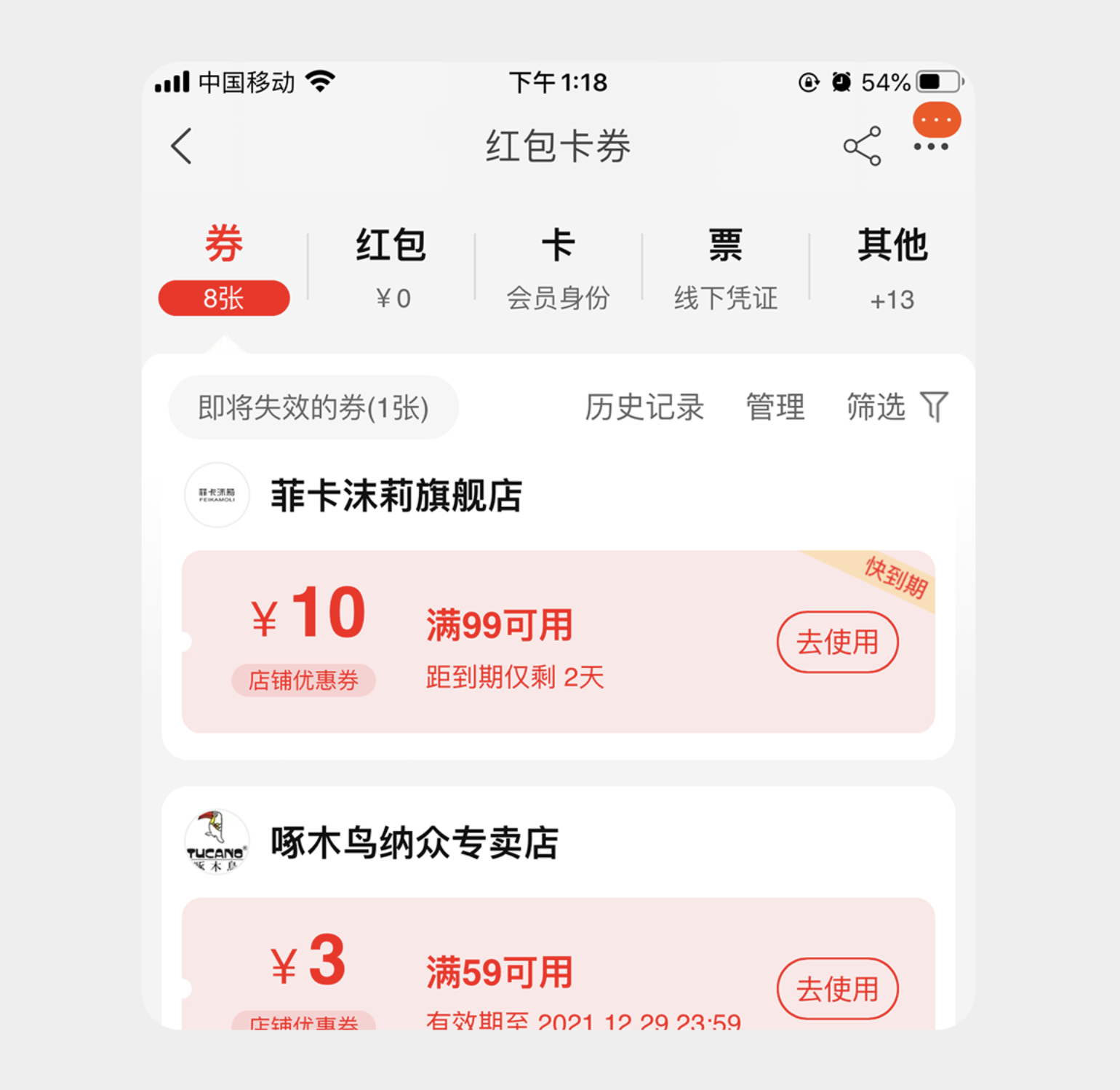 采用標(biāo)題與副標(biāo)題上下布局的形式,副標(biāo)題精煉提煉核心信息或解釋標(biāo)題含義,通過顏色變化區(qū)分選中與未選中狀態(tài)。像中國移動的紅包卡券頁面,標(biāo)簽頁用 “券”“紅包”“卡” 作為標(biāo)題,搭配簡潔副標(biāo)題補(bǔ)充說明,用戶無需點(diǎn)擊就能快速了解各標(biāo)簽下的內(nèi)容,提升操作效率;基金產(chǎn)品的 “一筆投”“定投” 標(biāo)簽頁,也通過副標(biāo)題點(diǎn)明 “便捷”“穩(wěn)健” 的核心差異,幫助用戶快速做選擇。