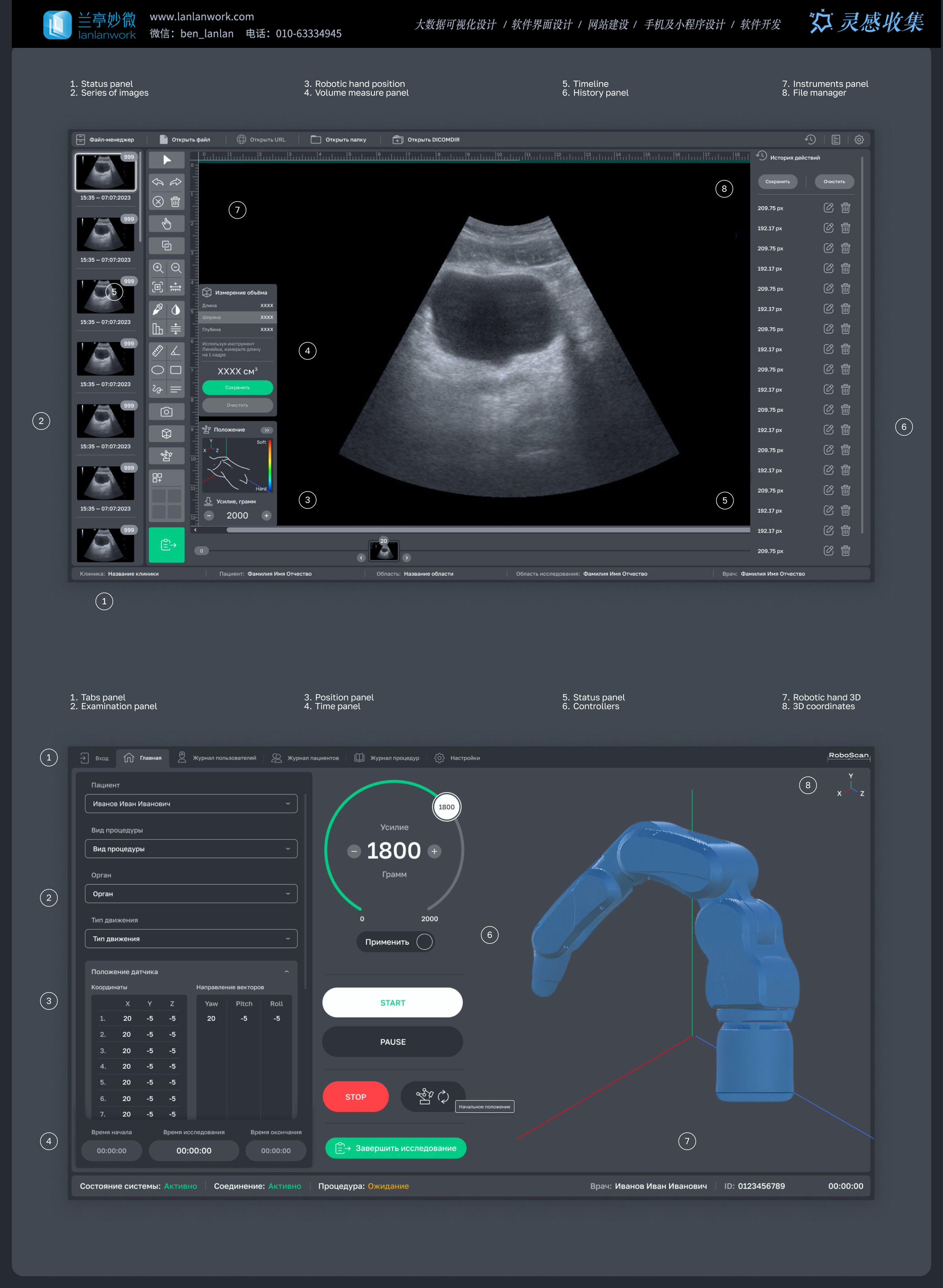 當(dāng)醫(yī)療機器人界面還停留在 “設(shè)備控制 + 數(shù)據(jù)展示” 的分離邏輯時,蘭亭妙微這套超聲機器人系統(tǒng)界面,以「影像 - 操作雙維協(xié)同」的設(shè)計思路,重構(gòu)了 “醫(yī)生 - 機器人 - 患者” 的交互關(guān)系。它不僅是一個操作面板,更是醫(yī)療機器人領(lǐng)域 “精準性與易用性平衡” 的標桿案例。