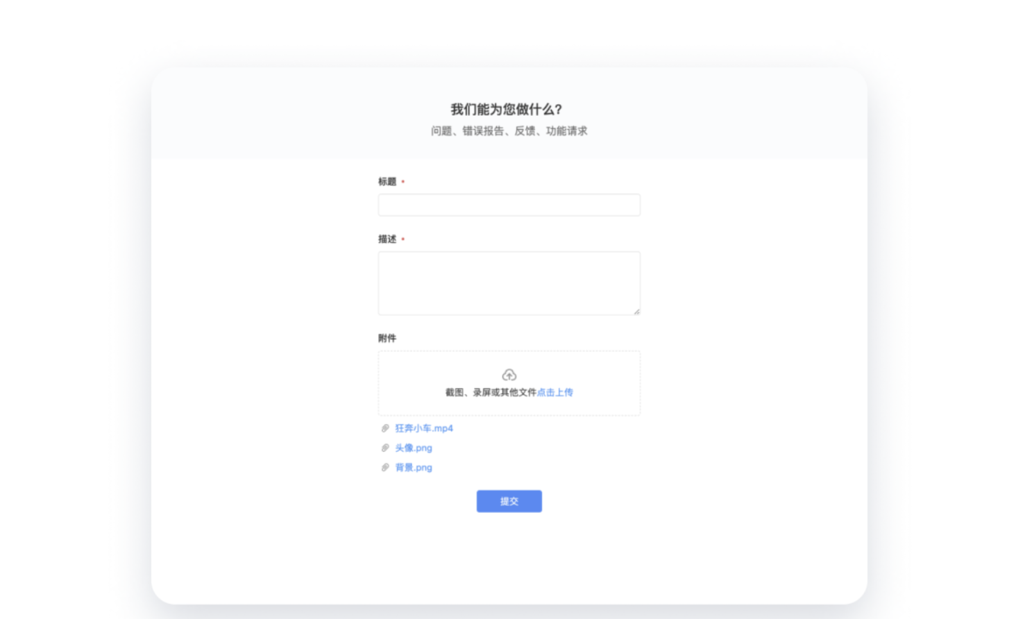用戶提交產(chǎn)品反饋時(shí),僅需填寫 “標(biāo)題”“描述”“附件” 三項(xiàng)信息,基礎(chǔ)表單可直接平鋪展示,無需額外分組或步驟,讓用戶在 30 秒內(nèi)完成操作。
