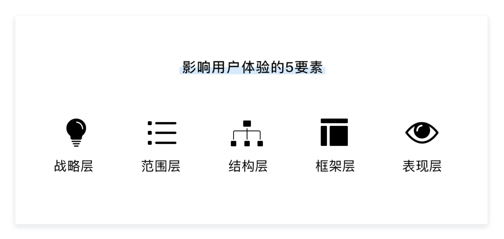 無(wú)論 UX 設(shè)計(jì)的形式如何變化,其核心框架始終圍繞《用戶體驗(yàn)要素》提出的戰(zhàn)略層、范圍層、結(jié)構(gòu)層、框架層、表現(xiàn)層五個(gè)層級(jí)展開(kāi)。這五個(gè)層級(jí)從抽象到具體、從概念到落地,構(gòu)成了 UX 設(shè)計(jì)的完整邏輯體系,既是分析產(chǎn)品的工具,也是從 0 到 1 打造產(chǎn)品的核心方法論。
