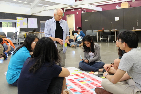 (圖為學(xué)員們?cè)贒.School用便利貼和海報(bào)紙來(lái)記錄想到的點(diǎn)子,白發(fā)老爺爺是D.School的講師,以前是Yahoo的PM,專門(mén)帶Ideate這一部分,講師們都有自己最擅長(zhǎng)和最喜歡帶的一個(gè)模塊)